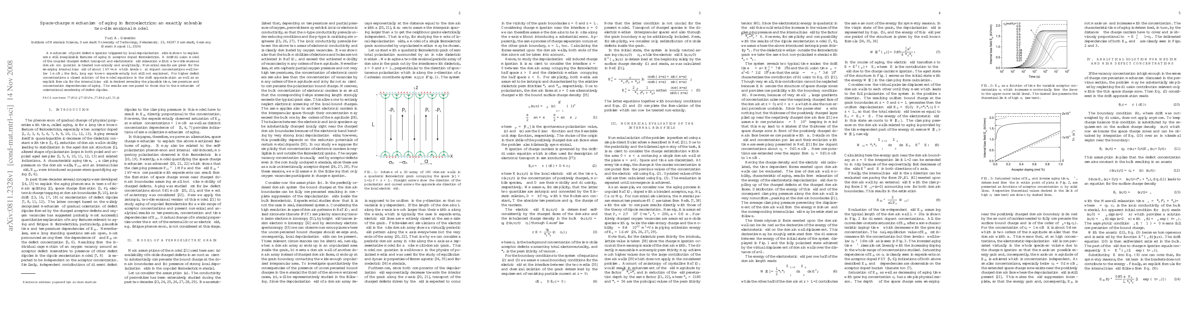 A mechanism of point defect migration triggered by local depolarization fields is shown to explain some still inexplicable features of aging in acceptor doped ferroelectrics. A drift-diffusion model of the coupled charged defect transport and electrostatic field relaxation within a two-dimensional domain configuration is treated numerically and analytically. Numerical results are given for the emerging internal bias field of about 1 kV/mm which levels off at dopant concentrations well below 1 mol%; the fact, long ago known experimentally but still not explained. For higher defect concentrations a closed solution of the model equations in the drift approximation as well as an explicit formula for the internal bias field is derived revealing the plausible time, temperature and concentration dependencies of aging. The results are compared to those due to the mechanism of orientational reordering of defect dipoles.