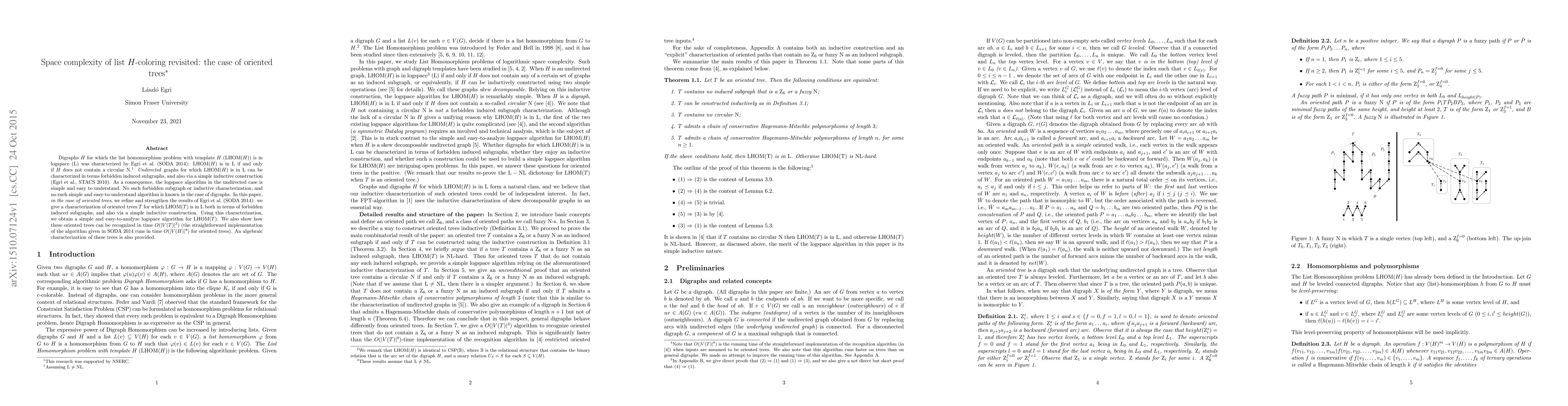 Digraphs H for which the list homomorphism problem with template H (LHOM(H)) is in logspace (L) was characterized by Egri et al. (SODA 2014): LHOM(H) is in L if and only if H does not contain a circular N (assuming L is different from NL). Undirected graphs for which LHOM(H) is in L can be characterized in terms forbidden induced subgraphs, and also via a simple inductive construction (Egri et al., STACS 2010). As a consequence, the logspace algorithm in the undirected case is simple and easy to understand. No such forbidden subgraph or inductive characterization, and no such simple and easy-to-understand algorithm is known in the case of digraphs. In this paper, in the case of oriented trees, we refine and strengthen the results of Egri et al. (SODA 2014): we give a characterization of oriented trees T for which LHOM(T) is in L both in terms of forbidden induced subgraphs, and also via a simple inductive construction. Using this characterization, we obtain a simple and easy-to-analyze logspace algorithm for LHOM(T). We also show how these oriented trees can be recognized in time O(|V(T)|^3) (the straightforward implementation of the algorithm given in SODA 2014 runs in time O(|V(H)|^8) for oriented trees). An algebraic characterization of these trees is also provided.