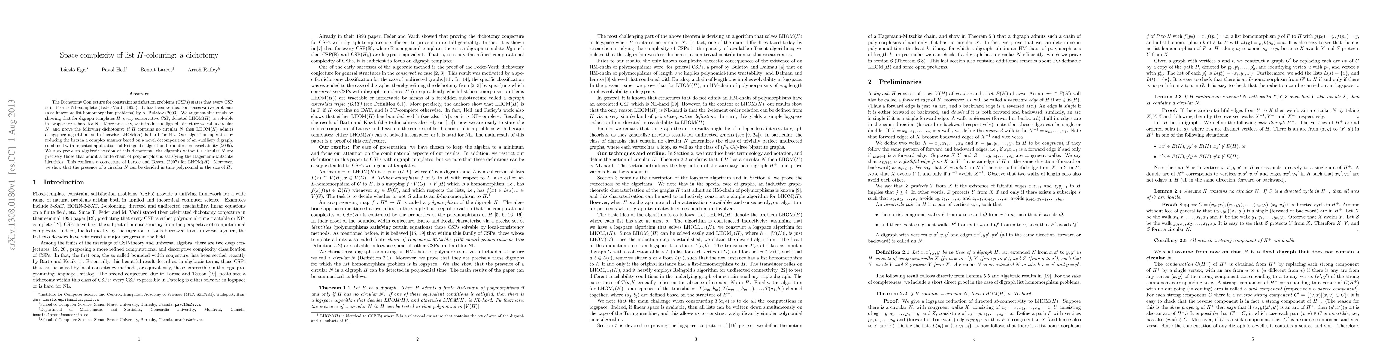 This paper establishes a space complexity dichotomy for list H-colouring problems (LHOM) on digraph templates H: either LHOM(H) can be solved in logspace, or it is hard for NL, depending on whether H contains a circular N structure. The authors introduce an innovative decomposition method and utilize Reingold's algorithm to achieve this result.