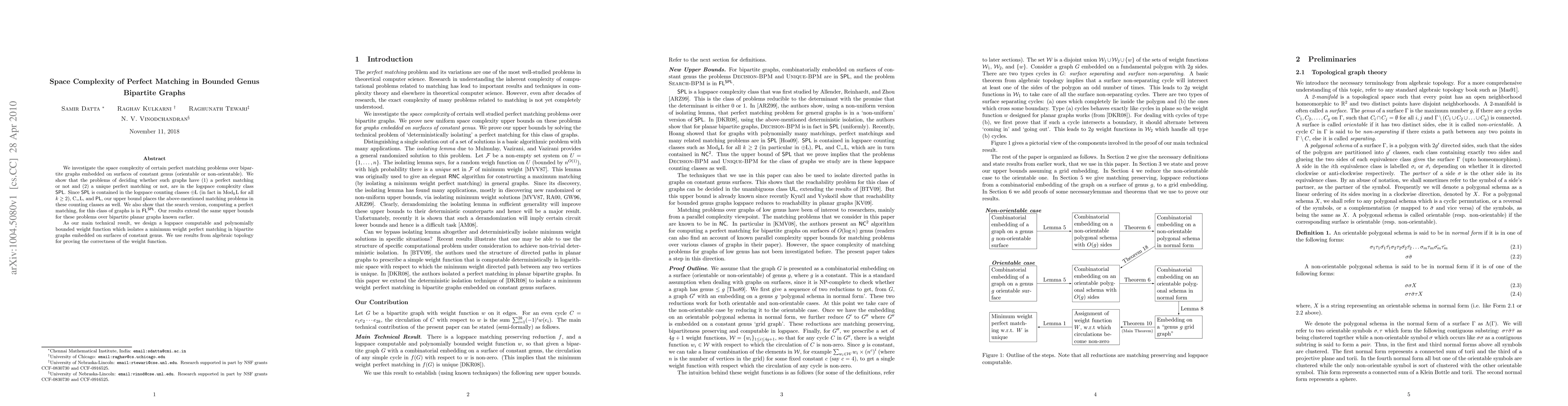 This paper explores the space complexity of perfect matching problems in bipartite graphs on surfaces of constant genus, showing these problems are in the logspace complexity class \SPL. The authors also demonstrate that these problems are in broader counting classes and use a logspace computable weight function to isolate minimum weight perfect matchings, leveraging results from algebraic topology.
