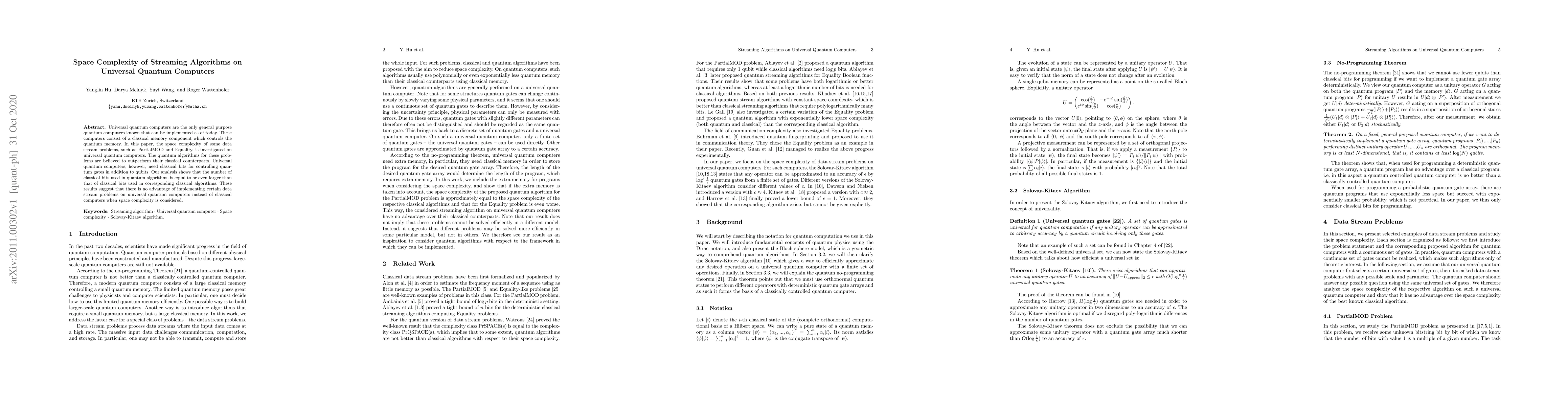 This paper investigates the space complexity of streaming algorithms on universal quantum computers, finding that the number of classical bits used in quantum algorithms can be equal to or exceed those in classical algorithms, indicating no space complexity advantage for quantum implementations.