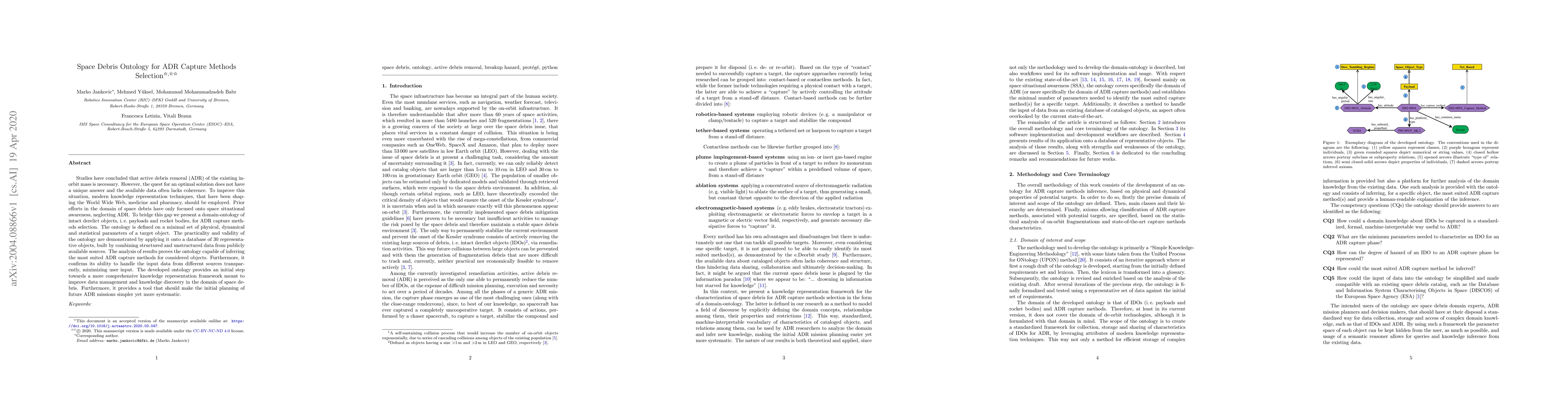 Studies have concluded that active debris removal (ADR) of the existing in-orbit mass is necessary. However, the quest for an optimal solution does not have a unique answer and the available data often lacks coherence. To improve this situation, modern knowledge representation techniques, that have been shaping the World Wide Web, medicine and pharmacy, should be employed. Prior efforts in the domain of space debris have only focused onto space situational awareness, neglecting ADR. To bridge this gap we present a domain-ontology of intact derelict objects, i.e. payloads and rocket bodies, for ADR capture methods selection. The ontology is defined on a minimal set of physical, dynamical and statistical parameters of a target object. The practicality and validity of the ontology are demonstrated by applying it onto a database of 30 representative objects, built by combining structured and unstructured data from publicly available sources. The analysis of results proves the ontology capable of inferring the most suited ADR capture methods for considered objects. Furthermore, it confirms its ability to handle the input data from different sources transparently, minimizing user input. The developed ontology provides an initial step towards a more comprehensive knowledge representation framework meant to improve data management and knowledge discovery in the domain of space debris. Furthermore, it provides a tool that should make the initial planning of future ADR missions simpler yet more systematic.