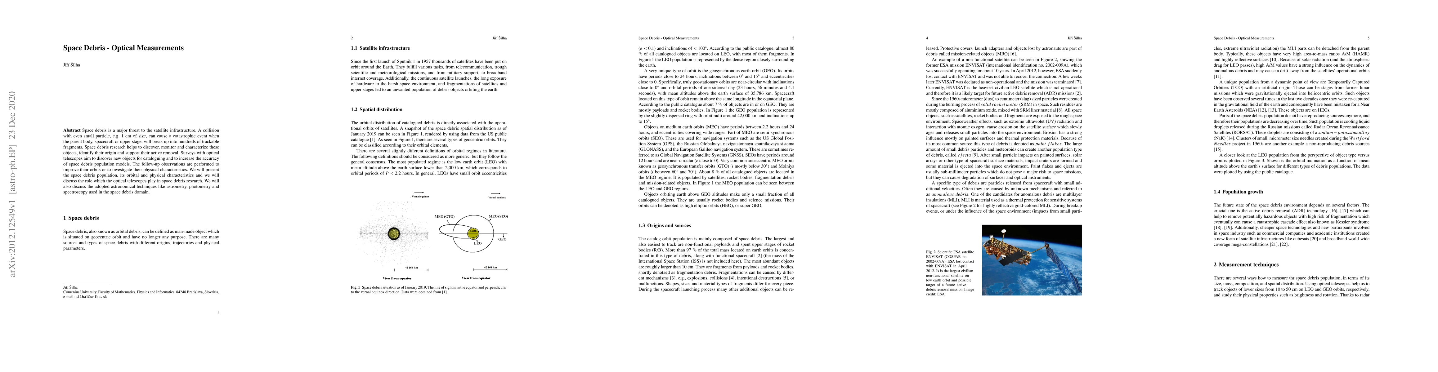 Space debris is a major threat to the satellite infrastructure. A collision with even small particle, e.g. 1 cm of size, can cause a catastrophic event when the parent body, spacecraft or upper stage, will break up into hundreds of trackable fragments. Space debris research helps to discover, monitor and characterize these objects, identify their origin and support their active removal. Surveys with optical telescopes aim to discover new objects for cataloguing and to increase the accuracy of space debris population models. The follow-up observations are performed to improve their orbits or to investigate their physical characteristics. We will present the space debris population, its orbital and physical characteristics and we will discuss the role which the optical telescopes play in space debris research. We will also discuss the adopted astronomical techniques like astrometry, photometry and spectroscopy used in the space debris domain.