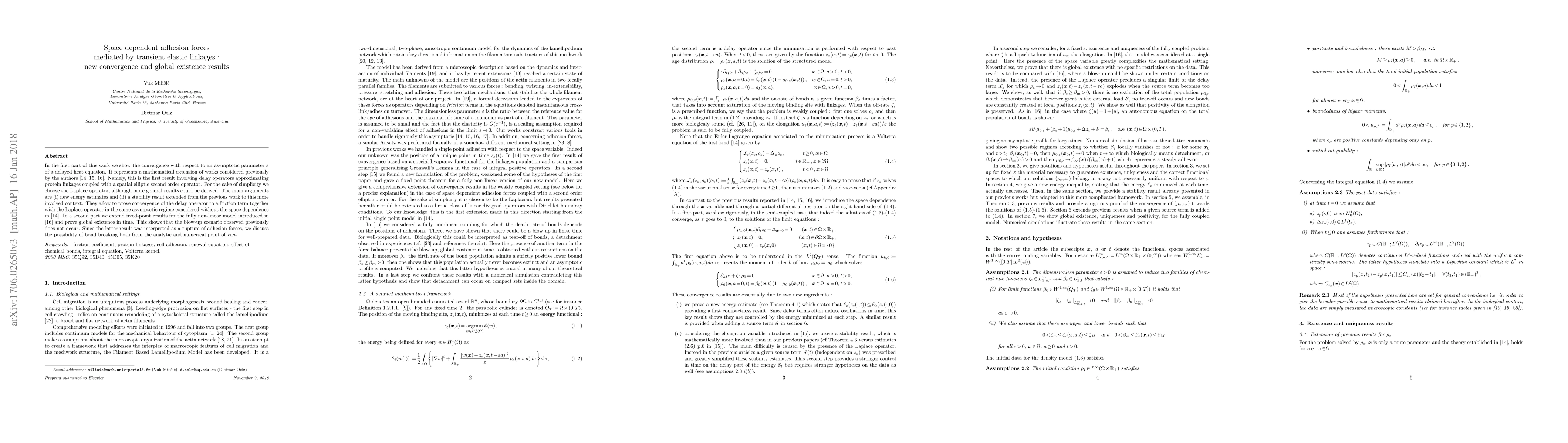 In the first part of this work we show the convergence with respect to an asymptotic parameter {\epsilon} of a delayed heat equation. It represents a mathematical extension of works considered previously by the authors [Milisic et al. 2011, Milisic et al. 2016]. Namely, this is the first result involving delay operators approximating protein linkages coupled with a spatial elliptic second order operator. For the sake of simplicity we choose the Laplace operator, although more general results could be derived. The main arguments are (i) new energy estimates and (ii) a stability result extended from the previous work to this more involved context. They allow to prove convergence of the delay operator to a friction term together with the Laplace operator in the same asymptotic regime considered without the space dependence in [Milisic et al, 2011]. In a second part we extend fixed-point results for the fully non-linear model introduced in [Milisic et al, 2016] and prove global existence in time. This shows that the blow-up scenario observed previously does not occur. Since the latter result was interpreted as a rupture of adhesion forces, we discuss the possibility of bond breaking both from the analytic and numerical point of view.