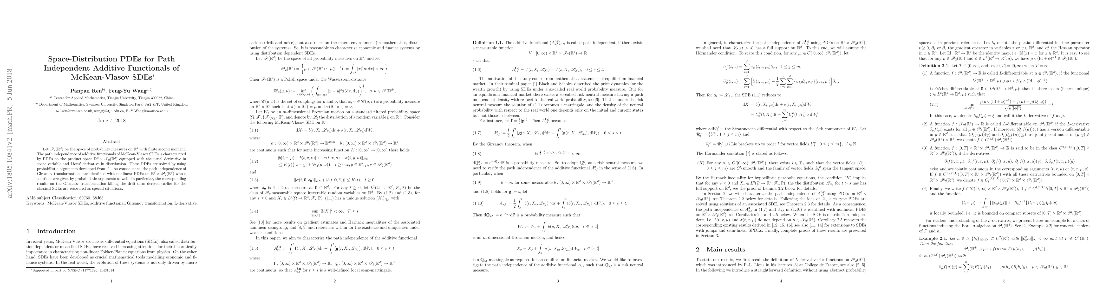 Let P2(Rd) be the space of probability measures on Rd with finite second moment. The path independence of additive functionals of McKean-Vlasov SDEs is characterized by PDEs on the product space Rd*P2(Rd) equipped with the usual derivative in space variable and Lions derivative in distribution. These PDEs are solved by using probabilis- tic arguments developed from [2]. In particular, the path independence of the Girsanov transformation killing the drift term is identified with a nonlinear PDE on Rd*P2(Rd), which includes corresponding results derived earlier for the classical SDEs as special situations.