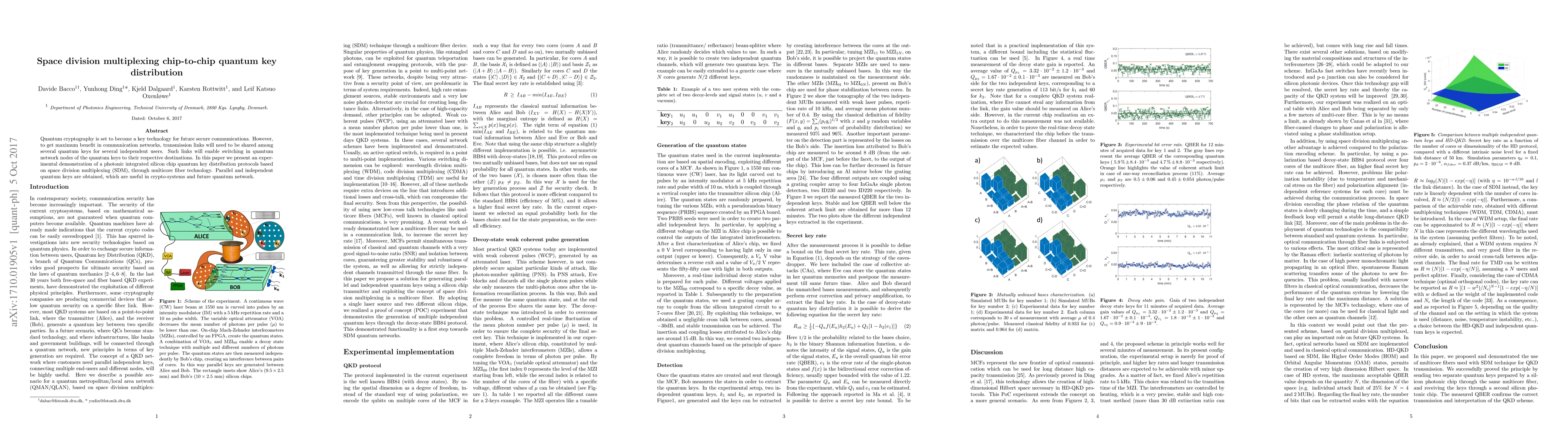 This paper demonstrates a photonic integrated silicon chip for quantum key distribution using space division multiplexing through multicore fiber technology, enabling parallel and independent quantum keys for secure communications in future quantum networks.