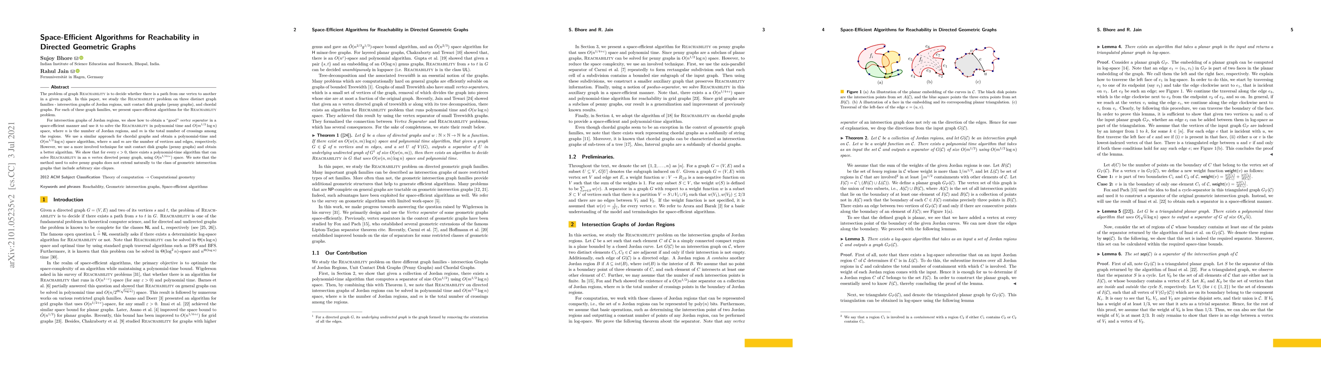 This paper presents space-efficient algorithms for Reachability in three distinct graph families: intersection graphs of Jordan regions, unit contact disk graphs, and chordal graphs. It achieves polynomial-time solutions with space complexities of $O(m^{1/2}\log n)$ for Jordan regions and chordal graphs, and $O(n^{1/4+\epsilon})$ for unit contact disk graphs.