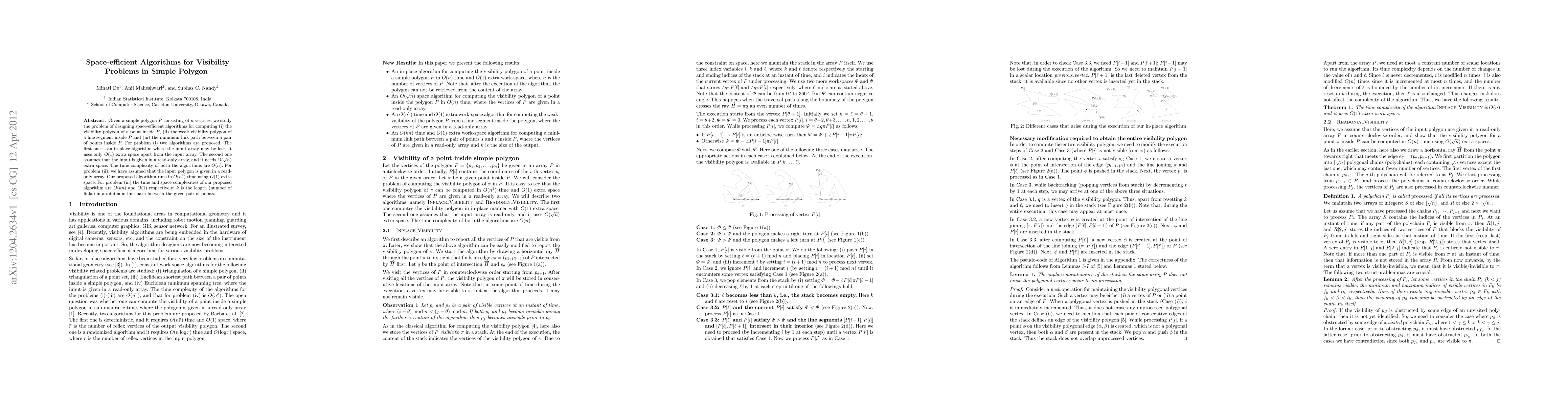 This paper proposes space-efficient algorithms for computing visibility polygons and minimum link paths in simple polygons. For point visibility, two in-place algorithms are presented, one using O(1) and the other O(√n) extra space. For line segment visibility and minimum link paths, algorithms with O(n²) and O(kn) time complexities, respectively, are introduced, both using O(1) extra space.