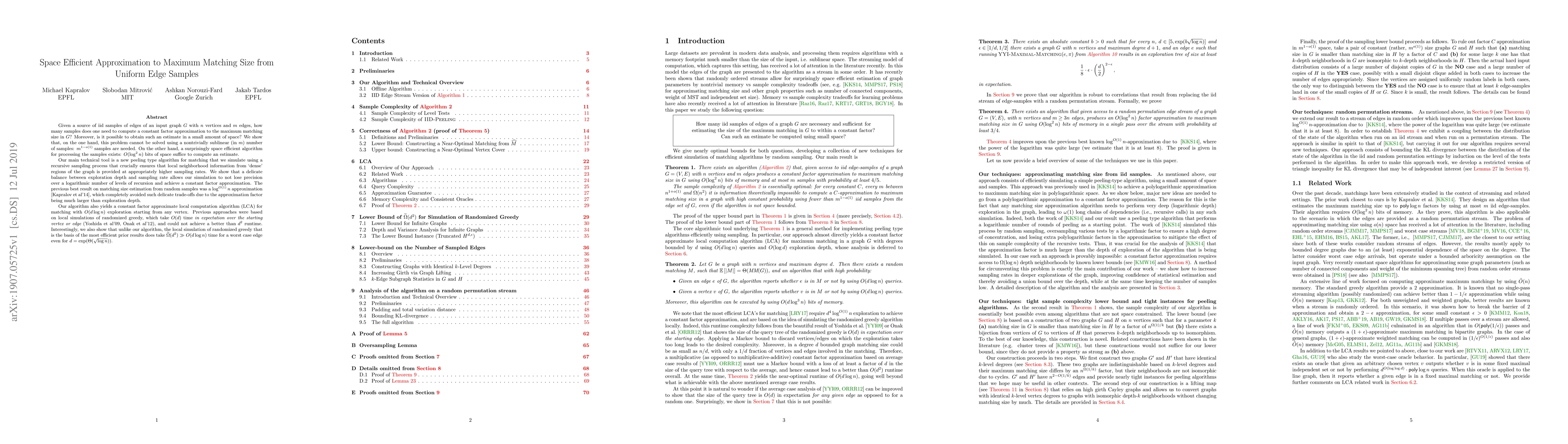 Given a source of iid samples of edges of an input graph $G$ with $n$ vertices and $m$ edges, how many samples does one need to compute a constant factor approximation to the maximum matching size in $G$? Moreover, is it possible to obtain such an estimate in a small amount of space? We show that, on the one hand, this problem cannot be solved using a nontrivially sublinear (in $m$) number of samples: $m^{1-o(1)}$ samples are needed. On the other hand, a surprisingly space efficient algorithm for processing the samples exists: $O(\log^2 n)$ bits of space suffice to compute an estimate. Our main technical tool is a new peeling type algorithm for matching that we simulate using a recursive sampling process that crucially ensures that local neighborhood information from `dense' regions of the graph is provided at appropriately higher sampling rates. We show that a delicate balance between exploration depth and sampling rate allows our simulation to not lose precision over a logarithmic number of levels of recursion and achieve a constant factor approximation. The previous best result on matching size estimation from random samples was a $\log^{O(1)} n$ approximation [Kapralov et al'14]. Our algorithm also yields a constant factor approximate local computation algorithm (LCA) for matching with $O(d\log n)$ exploration starting from any vertex. Previous approaches were based on local simulations of randomized greedy, which take $O(d)$ time {\em in expectation over the starting vertex or edge} (Yoshida et al'09, Onak et al'12), and could not achieve a better than $d^2$ runtime. Interestingly, we also show that unlike our algorithm, the local simulation of randomized greedy that is the basis of the most efficient prior results does take $\wt{\Omega}(d^2)\gg O(d\log n)$ time for a worst case edge even for $d=\exp(\Theta(\sqrt{\log n}))$.
