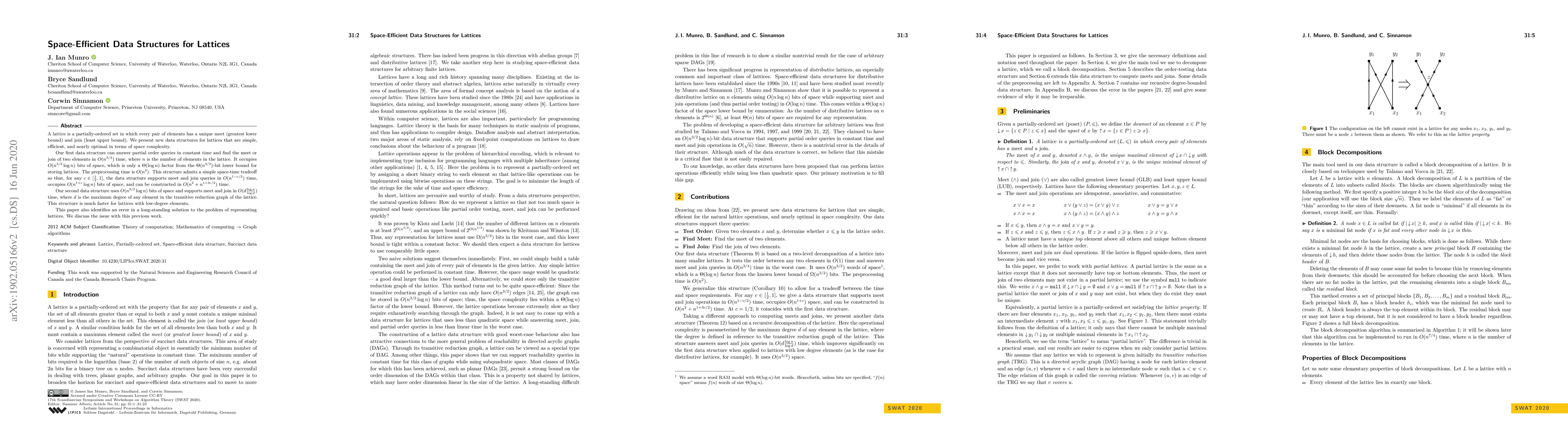 A lattice is a partially-ordered set in which every pair of elements has a unique meet (greatest lower bound) and join (least upper bound). We present new data structures for lattices that are simple, efficient, and nearly optimal in terms of space complexity. Our first data structure can answer partial order queries in constant time and find the meet or join of two elements in $O(n^{3/4})$ time, where $n$ is the number of elements in the lattice. It occupies $O(n^{3/2}\log n)$ bits of space, which is only a $\Theta(\log n)$ factor from the $\Theta(n^{3/2})$-bit lower bound for storing lattices. The preprocessing time is $O(n^2)$. This structure admits a simple space-time tradeoff so that, for any $c \in [\frac{1}{2}, 1]$, the data structure supports meet and join queries in $O(n^{1-c/2})$ time, occupies $O(n^{1+c}\log n)$ bits of space, and can be constructed in $O(n^2 + n^{1+3c/2})$ time. Our second data structure uses $O(n^{3/2}\log n)$ bits of space and supports meet and join in $O(d \frac{\log n}{\log d})$ time, where $d$ is the maximum degree of any element in the transitive reduction graph of the lattice. This structure is much faster for lattices with low-degree elements. This paper also identifies an error in a long-standing solution to the problem of representing lattices. We discuss the issue with this previous work.