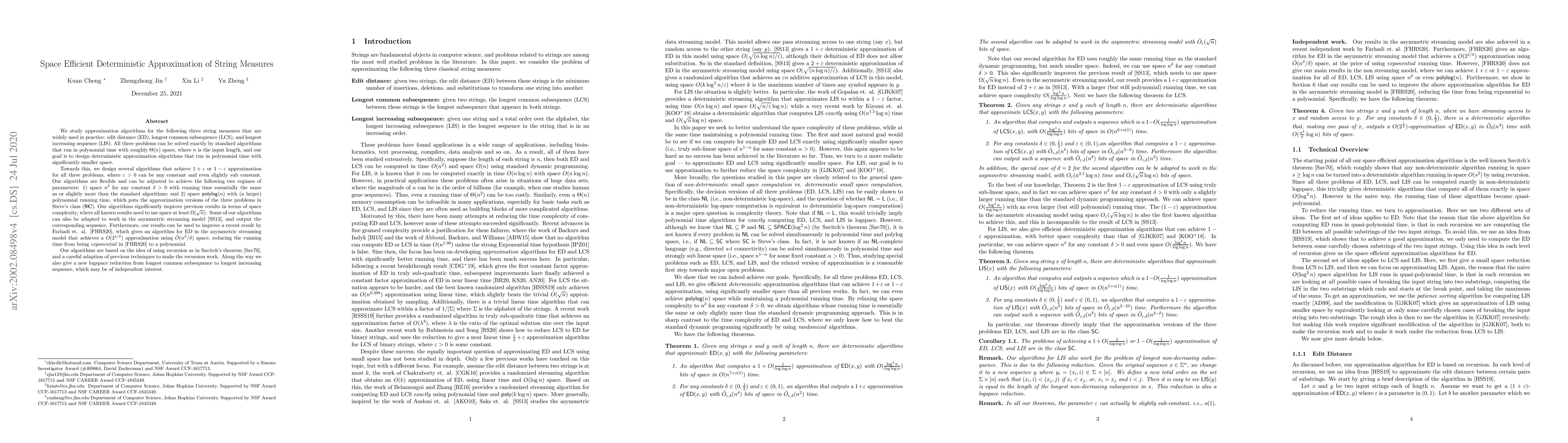 We study approximation algorithms for the following three string measures that are widely used in practice: edit distance (ED), longest common subsequence (LCS), and longest increasing sequence (LIS). All three problems can be solved exactly by standard algorithms that run in polynomial time with roughly $\Theta(n)$ space, where $n$ is the input length, and our goal is to design deterministic approximation algorithms that run in polynomial time with significantly smaller space. Towards this, we design several algorithms that achieve $1+\epsilon$ or $1-\epsilon$ approximation for all three problems, where $\epsilon>0$ can be any constant and even slightly sub constant. Our algorithms are flexible and can be adjusted to achieve the following two regimes of parameters: 1) space $n^\delta$ for any constant $\delta>0$ with running time essentially the same as or slightly more than the standard algorithms; and 2) space $\mathsf{polylog}(n)$ with (a larger) polynomial running time, which puts the approximation versions of the three problems in Steve's class (\textbf{SC}). Our algorithms significantly improve previous results in terms of space complexity, where all known results need to use space at least $\Omega(\sqrt{n})$. Some of our algorithms can also be adapted to work in the asymmetric streaming model [SS13], and output the corresponding sequence. Furthermore, our results can be used to improve a recent result by Farhadi et. al. [FHRS20] about approximating ED in the asymmetric streaming model, reducing the running time from being exponential in [FHRS20] to a polynomial. Our algorithms are based on the idea of using recursion as in Savitch's theorem [Sav70], and a careful adaption of previous techniques to make the recursion work. Along the way we also give a new logspace reduction from longest common subsequence to longest increasing sequence, which may be of independent interest.