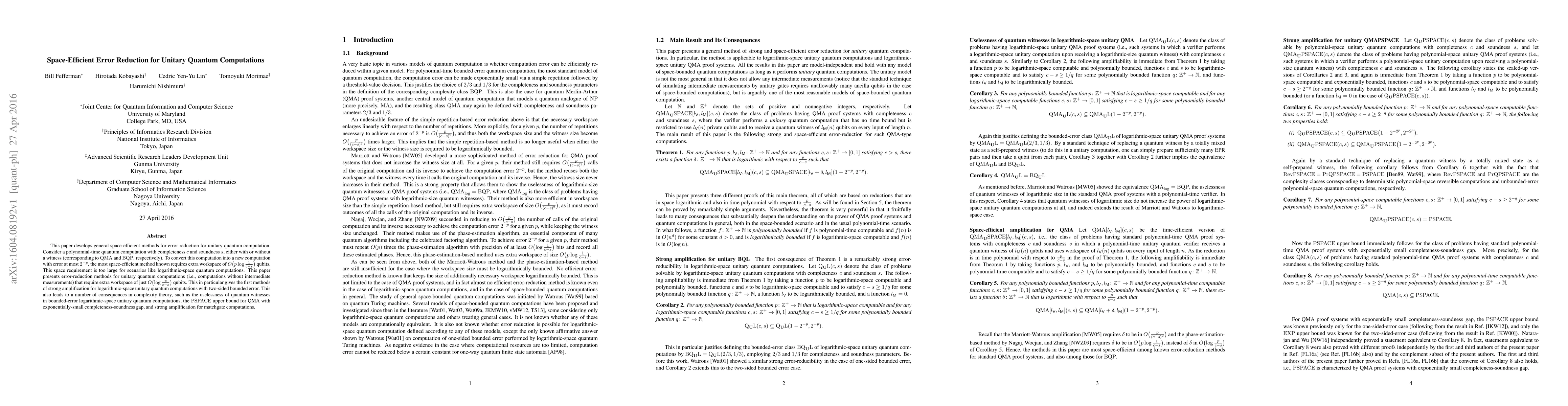 This paper introduces space-efficient error reduction techniques for unitary quantum computations, requiring only ${O \bigl( \log \frac{p}{c-s} \bigr)}$ extra qubits, significantly improving upon the previously known ${O \bigl( p \log \frac{1}{c-s} \bigr)}$ requirement, with implications for logarithmic-space quantum computations and complexity theory.