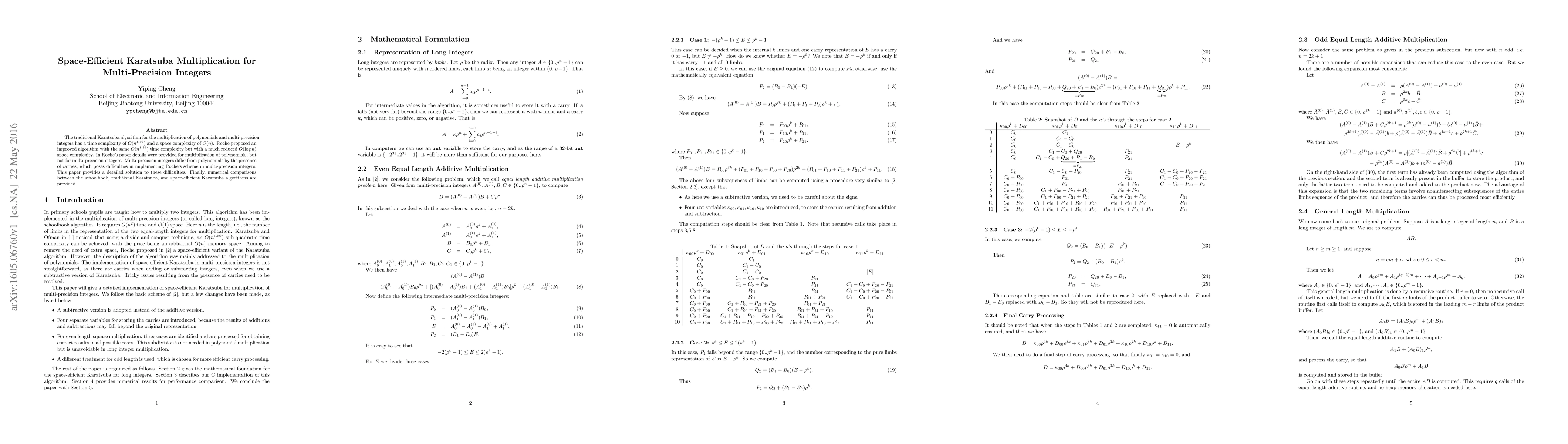 The traditional Karatsuba algorithm for the multiplication of polynomials and multi-precision integers has a time complexity of $O(n^{1.59})$ and a space complexity of $O(n)$. Roche proposed an improved algorithm with the same $O(n^{1.59})$ time complexity but with a much reduced $O(\log n)$ space complexity. In Roche's paper details were provided for multiplication of polynomials, but not for multi-precision integers. Multi-precision integers differ from polynomials by the presence of carries, which poses difficulties in implementing Roche's scheme in multi-precision integers. This paper provides a detailed solution to these difficulties. Finally, numerical comparisons between the schoolbook, traditional Karatsuba, and space-efficient Karatsuba algorithms are provided.