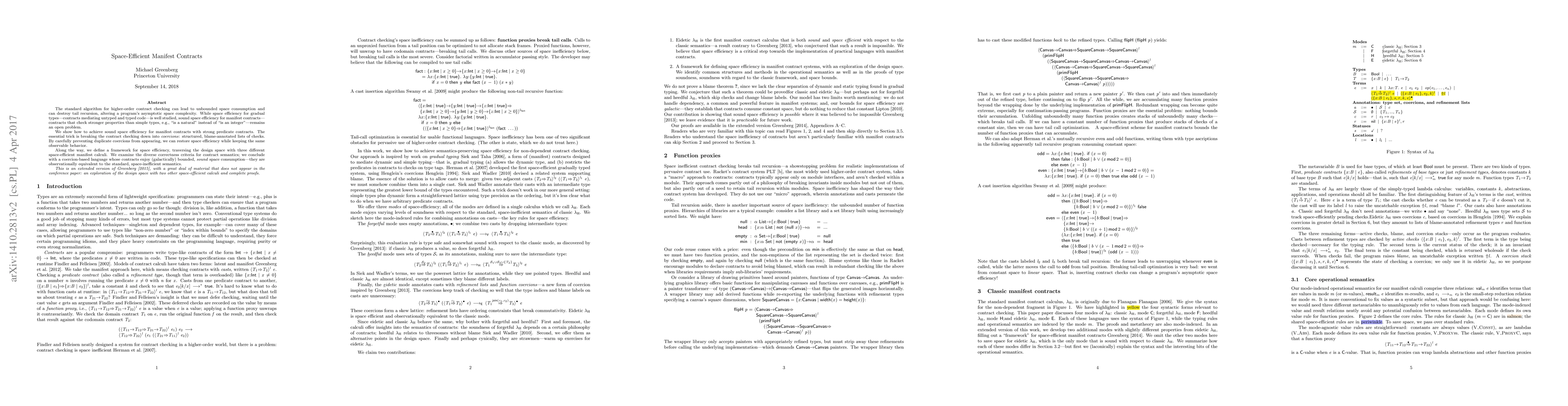 This paper presents a method for achieving sound space efficiency in manifest contracts, which check stronger properties than simple types, by breaking contract checking into structured, blame-annotated lists of checks. The approach avoids duplicate coercions to maintain space efficiency while preserving observable behavior.