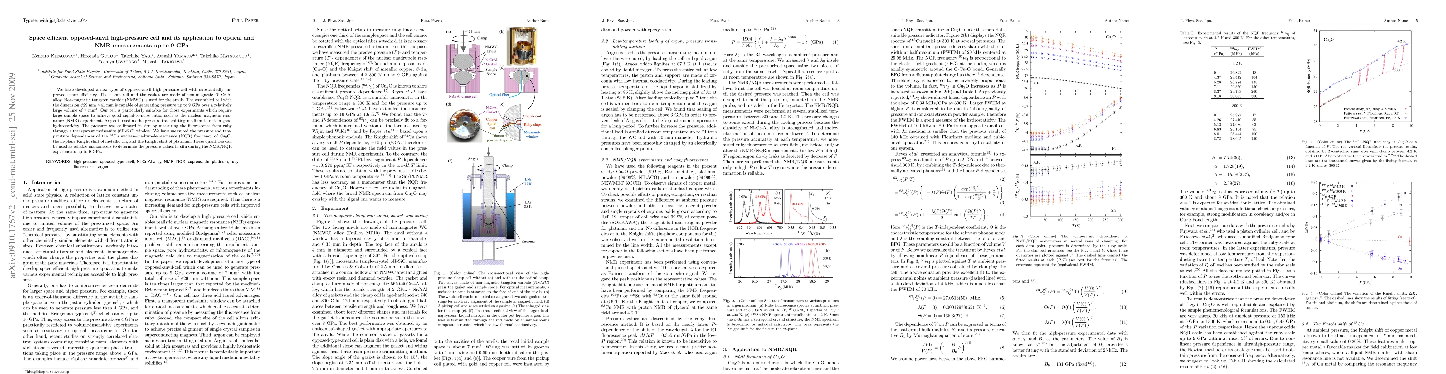 We have developed a new type of opposed-anvil high pressure cell with substantially improved space efficiency. The clamp cell and the gasket are made of non-magnetic Ni-Cr-Al alloy. Non-magnetic tungsten carbide (NMWC) is used for the anvils. The assembled cell with the dimension \phi 29mm \times 41mm is capable of generating pressure up to 9 GPa over a relatively large volume of 7 mm3. Our cell is particularly suitable for those experiments which require large sample space to achieve good signal-to-noise ratio, such as the nuclear magnetic resonance (NMR) experiment. Argon is used as the pressure transmitting medium to obtain good hydrostaticity. The pressure was calibrated in situ by measuring the fluorescence from ruby through a transparent moissanite (6H-SiC) window. We have measured the pressure and temperature dependences of the 63Cu nuclear-quadrupole-resonance (NQR) frequency of Cu2O, the in-plane Knight shift of metallic tin, and the Knight shift of platinum. These quantities can be used as reliable manometers to determine the pressure values in situ during the NMR/NQR experiments up to 9 GPa.