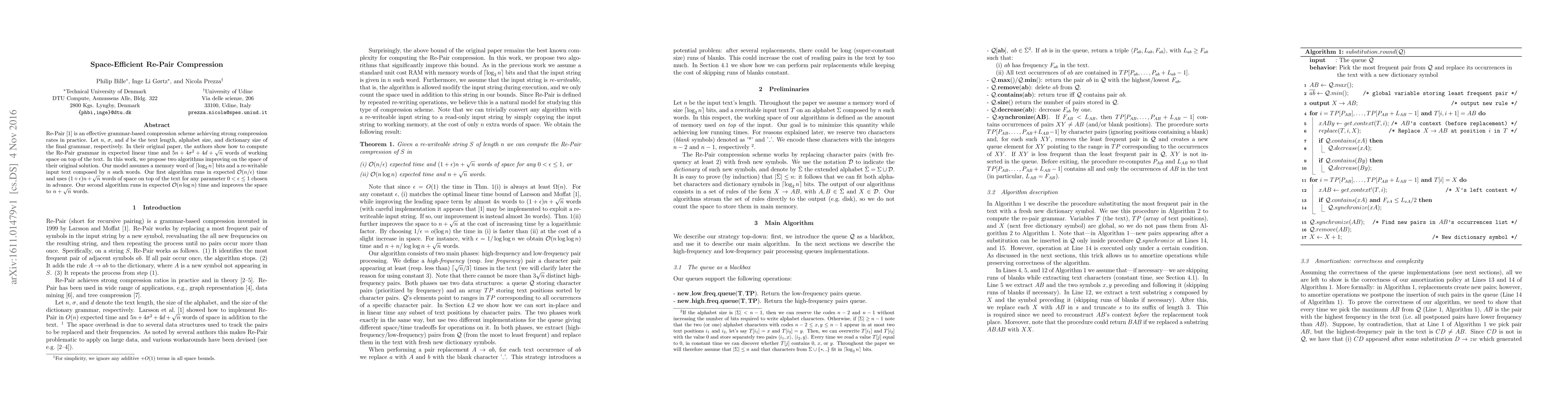 Re-Pair is an effective grammar-based compression scheme achieving strong compression rates in practice. Let $n$, $\sigma$, and $d$ be the text length, alphabet size, and dictionary size of the final grammar, respectively. In their original paper, the authors show how to compute the Re-Pair grammar in expected linear time and $5n + 4\sigma^2 + 4d + \sqrt{n}$ words of working space on top of the text. In this work, we propose two algorithms improving on the space of their original solution. Our model assumes a memory word of $\lceil\log_2 n\rceil$ bits and a re-writable input text composed by $n$ such words. Our first algorithm runs in expected $\mathcal O(n/\epsilon)$ time and uses $(1+\epsilon)n +\sqrt n$ words of space on top of the text for any parameter $0<\epsilon \leq 1$ chosen in advance. Our second algorithm runs in expected $\mathcal O(n\log n)$ time and improves the space to $n +\sqrt n$ words.