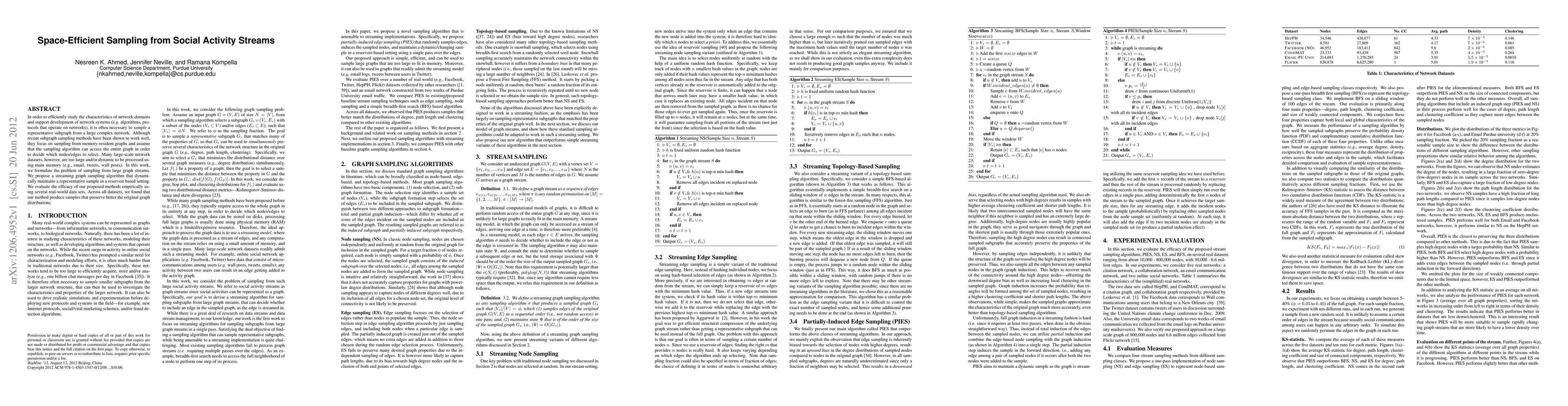 This paper proposes a space-efficient streaming graph sampling algorithm to extract representative subgraphs from large, dynamic network datasets that cannot fit into main memory. The method dynamically maintains a representative sample in a reservoir-based setting and is shown to better preserve original graph distributions compared to existing methods.