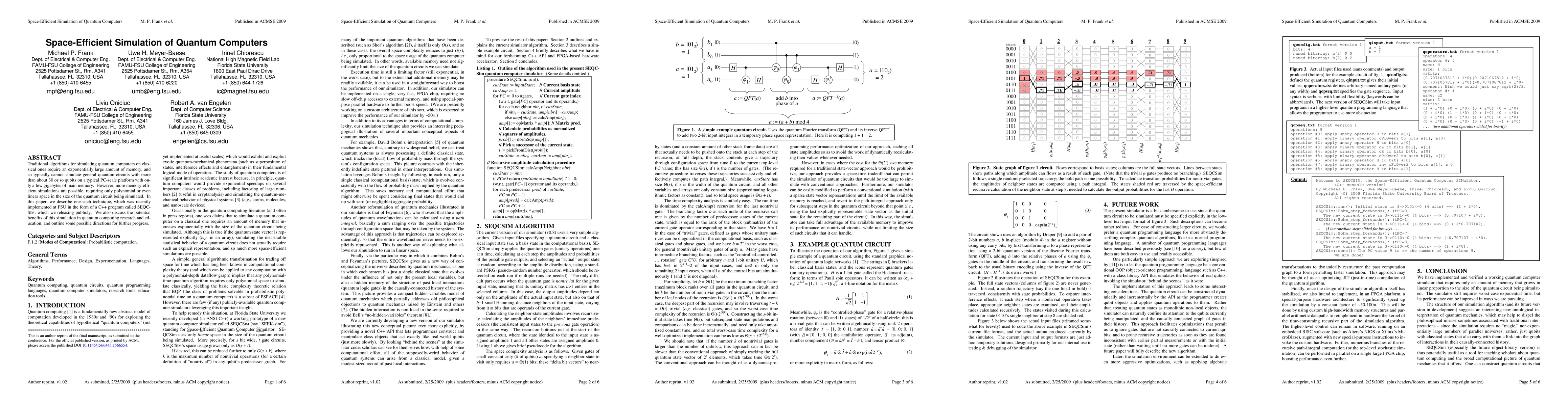 Traditional algorithms for simulating quantum computers on classical ones require an exponentially large amount of memory, and so typically cannot simulate general quantum circuits with more than about 30 or so qubits on a typical PC-scale platform with only a few gigabytes of main memory. However, more memory-efficient simulations are possible, requiring only polynomial or even linear space in the size of the quantum circuit being simulated. In this paper, we describe one such technique, which was recently implemented at FSU in the form of a C++ program called SEQCSim, which we releasing publicly. We also discuss the potential benefits of this simulation in quantum computing research and education, and outline some possible directions for further progress.
