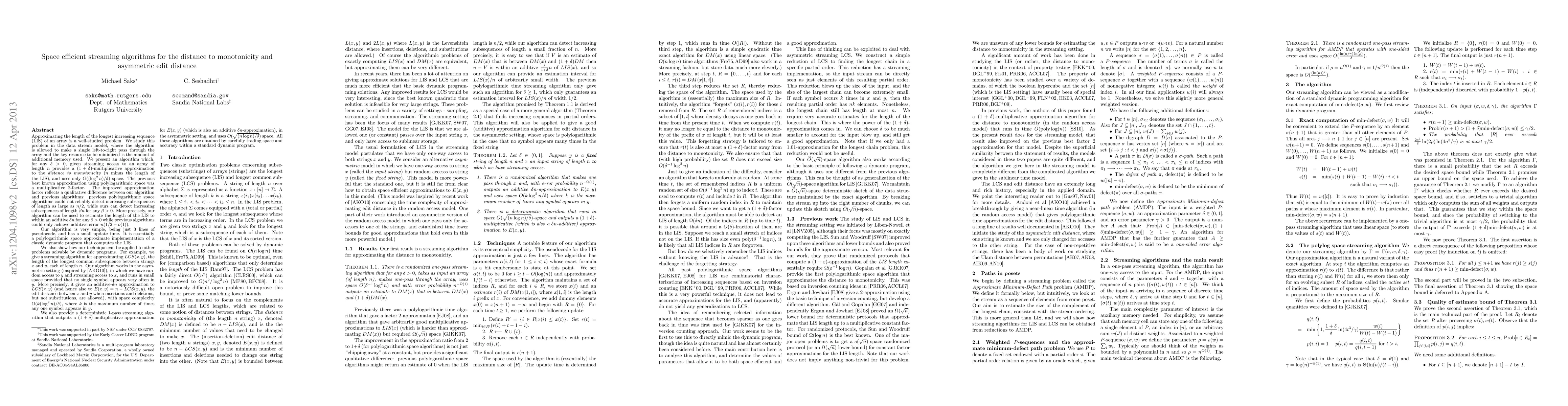 This paper presents space-efficient streaming algorithms for approximating the distance to monotonicity and asymmetric edit distance. It achieves a $(1+\delta)$-approximation to the distance to monotonicity using $O((\log^2 n)/\delta)$ space, improving previous multiplicative 2-factor approximations. It also provides an asymmetric edit distance approximation in small space when no symbol appears too frequently.