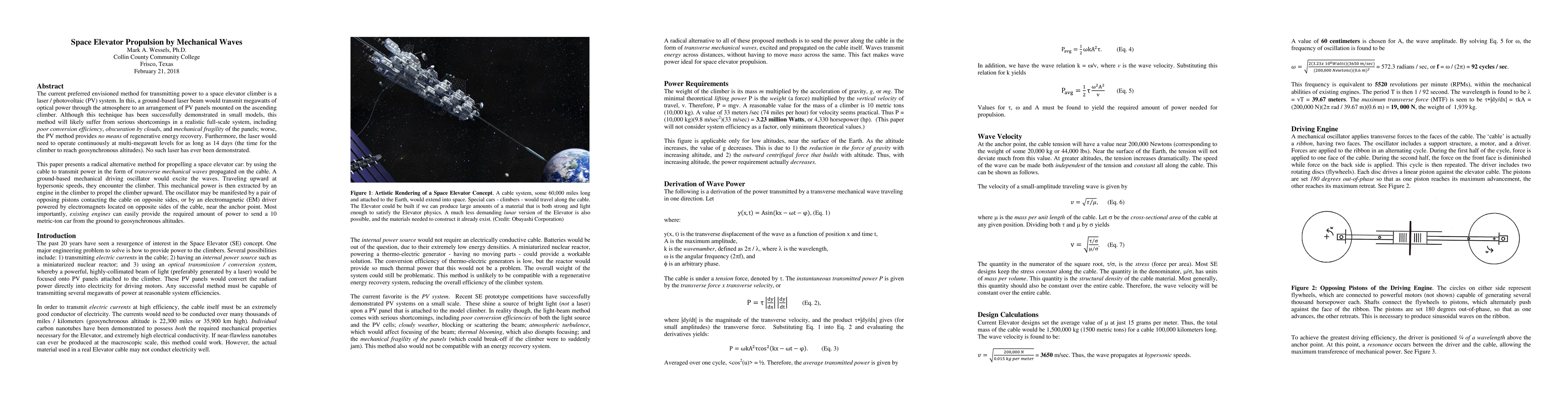 The current preferred envisioned method for transmitting power to a space elevator climber is a laser/photovoltaic (PV) system. In this, a ground-based laser beam would transmit megawatts of optical power through the atmosphere to an arrangement of PV panels mounted on the ascending climber. Although this technique has been successfully demonstrated in small models, this method will likely suffer from serious shortcomings in a realistic full-scale system, including poor conversion efficiency, obscuration by clouds, and mechanical fragility of the panels. Worse, the PV method provides no means of regenerative energy recovery. Furthermore, the laser would need to operate continuously at multi-megawatt levels for as long as 14 days (the time for the climber to reach geosynchronous altitudes). No such laser has ever been demonstrated. This paper presents a radical alternative method for propelling a space elevator car: by using the cable to transmit power in the form of transverse mechanical waves propagated on the cable. A ground-based mechanical driving oscillator would excite the waves. Traveling at hypersonic speeds, the waves encounter the climber. This mechanical power is then extracted by an engine in the climber to propel the climber upward. The oscillator may be manifested by a pair of opposing pistons contacting the cable on opposite sides of the cable, near the anchor point. Most importantly, existing engines can easily provide the required amount of power to send a 10 metric-ton car from the ground to geosynchronous altitudes.