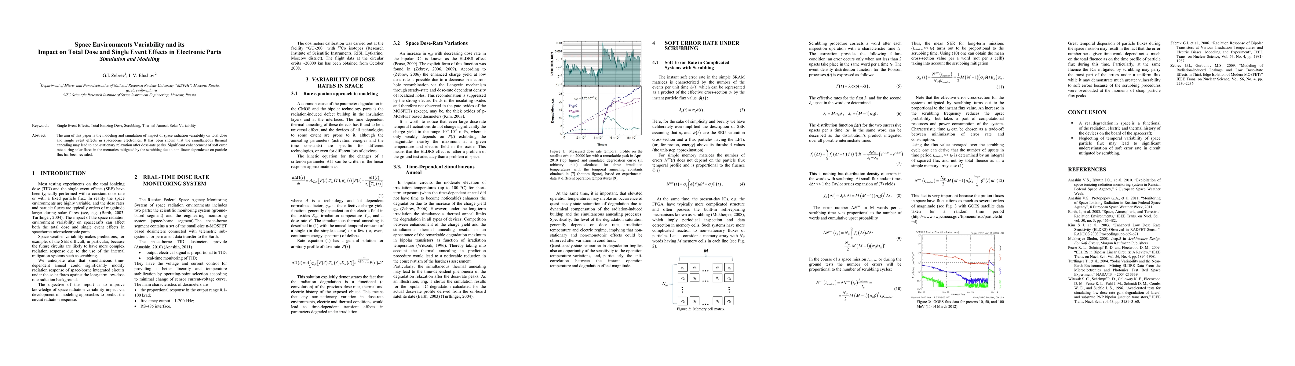The aim of this paper is the modeling and simulation of impact of space radiation variability on total dose and single event effects in spaceborne electronics. It has been shown that the simultaneous thermal annealing may lead to non-stationary relaxation after dose-rate peaks. Significant enhancement of soft error rate during solar flares in the memories mitigated by the scrubbing due to non-linear dependence on particle flux has been revealed.
