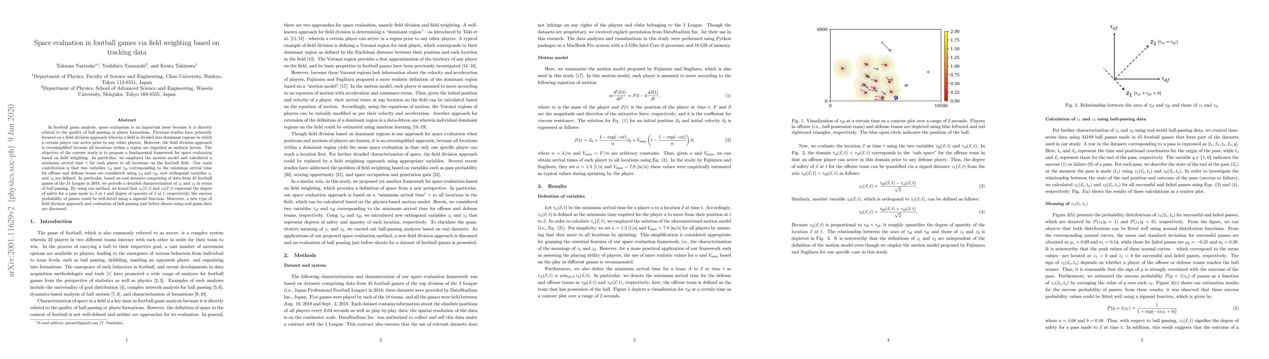 In football game analysis, space evaluation is an important issue because it is directly related to the quality of ball passing or player formations. Previous studies have primarily focused on a field division approach wherein a field is divided into dominant regions in which a certain player can arrive prior to any other players. However, the field division approach is oversimplified because all locations within a region are regarded as uniform herein. The objective of the current study is to propose a fundamental framework for space evaluation based on field weighting. In particular, we employed the motion model and calculated a minimum arrival time $ \tau $ for each player to all locations on the football field. Our main contribution is that two variables $ \tau_{\textrm{of}} $ and $ \tau_{\textrm{df}} $ corresponding to the minimum arrival time for offense and defense teams are considered; using $ \tau_{\textrm{of}} $ and $ \tau_{\textrm{df}} $, new orthogonal variables $ z_{1} $ and $ z_{2} $ are defined. In particular, based on real datasets comprising of data from 45 football games of the J1 League in 2018, we provide a detailed characterization of $ z_{1} $ and $ z_{2} $ in terms of ball passing. By using our method, we found that $ z_{1}(\vec{x}, t) $ and $ z_{2}(\vec{x}, t) $ represent the degree of safety for a pass made to $ \vec{x} $ at $ t $ and degree of sparsity of $ \vec{x} $ at $ t $, respectively; the success probability of passes could be well-fitted using a sigmoid function. Moreover, a new type of field division approach and evaluation of ball passing just before shoots using real game data are discussed.