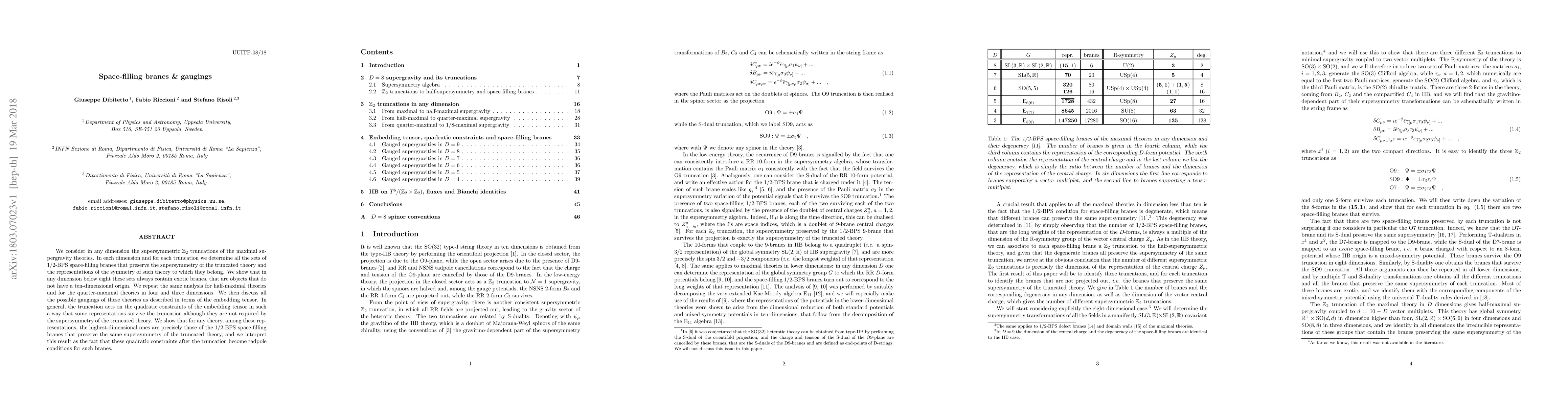 We consider in any dimension the supersymmetric $\mathbb{Z}_2$ truncations of the maximal supergravity theories. In each dimension and for each truncation we determine all the sets of 1/2-BPS space-filling branes that preserve the supersymmetry of the truncated theory and the representations of the symmetry of such theory to which they belong. We show that in any dimension below eight these sets always contain exotic branes, that are objects that do not have a ten-dimensional origin. We repeat the same analysis for half-maximal theories and for the quarter-maximal theories in four and three dimensions. We then discuss all the possible gaugings of these theories as described in terms of the embedding tensor. In general, the truncation acts on the quadratic constraints of the embedding tensor in such a way that some representations survive the truncation although they are not required by the supersymmetry of the truncated theory. We show that for any theory, among these representations, the highest-dimensional ones are precisely those of the 1/2-BPS space-filling branes that preserve the same supersymmetry of the truncated theory, and we interpret this result as the fact that these quadratic constraints after the truncation become tadpole conditions for such branes.