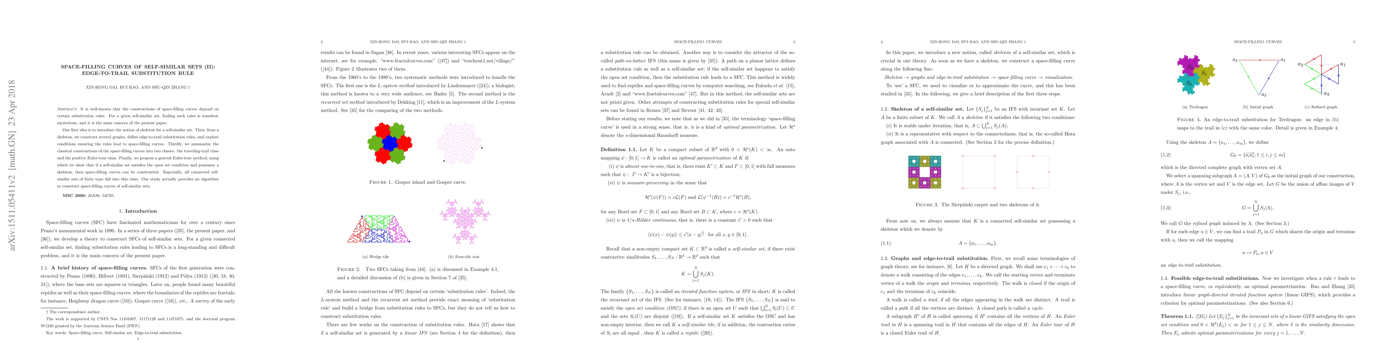 This paper explores the construction of space-filling curves for self-similar sets using edge-to-trail substitution rules. It introduces a skeleton concept and proposes a general Euler-tour method to construct space-filling curves for sets satisfying the open set condition and possessing a skeleton.