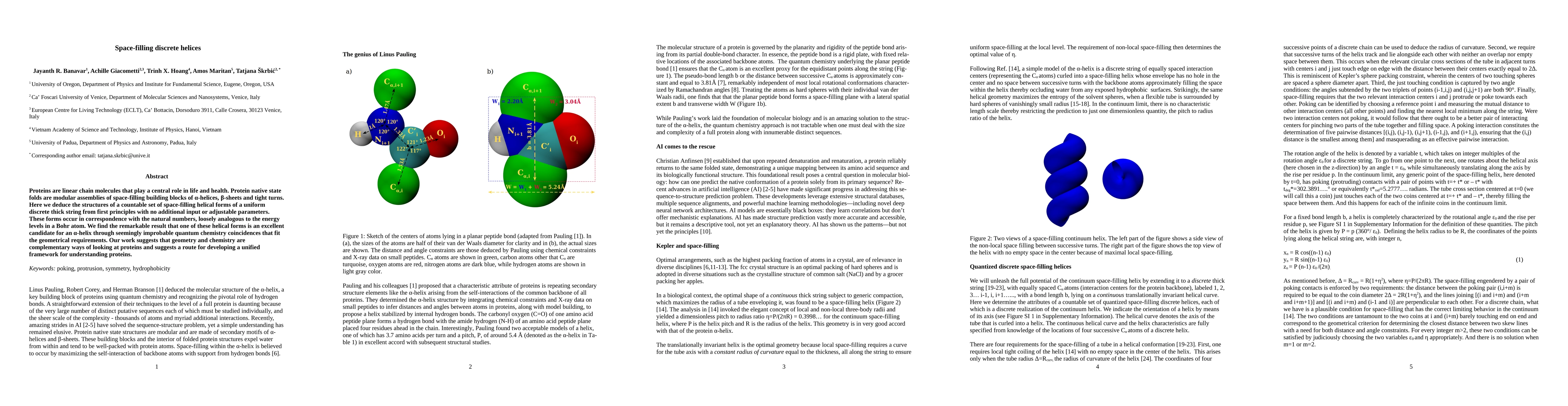 Proteins are linear chain molecules that play a central role in life and health. Protein native state folds are modular assemblies of space-filling building blocks of {\alpha}-helices, \{beta}-sheets and tight turns. Here we deduce the structures of a countable set of space-filling helical forms of a uniform discrete thick string from first principles with no additional input or adjustable parameters. These forms occur in correspondence with the natural numbers, loosely analogous to the energy levels in a Bohr atom. We find the remarkable result that one of these helical forms is an excellent candidate for an {\alpha}-helix through seemingly improbable quantum chemistry coincidences that fit the geometrical requirements. Our work suggests that geometry and chemistry are complementary ways of looking at proteins and suggests a route for developing a unified framework for understanding proteins.