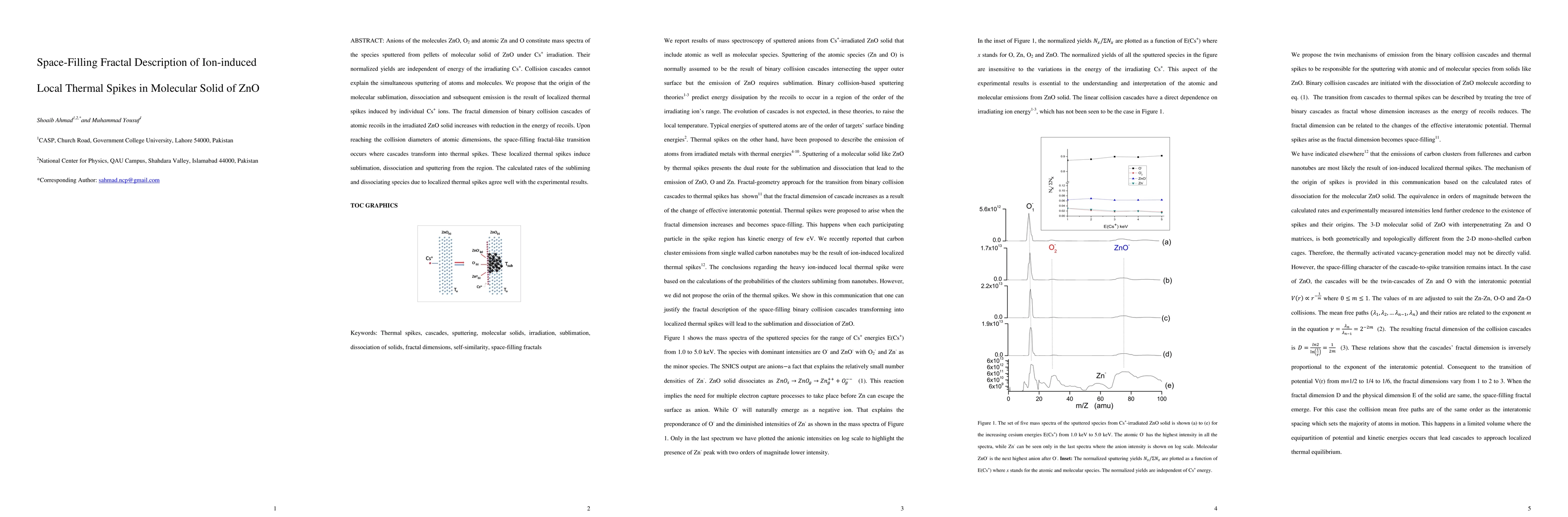 Anions of the molecules ZnO, O2 and atomic Zn and O constitute mass spectra of the species sputtered from pellets of molecular solid of ZnO under Cs+ irradiation. Their normalized yields are independent of energy of the irradiating Cs+. Collision cascades cannot explain the simultaneous sputtering of atoms and molecules. We propose that the origin of the molecular sublimation, dissociation and subsequent emission is the result of localized thermal spikes induced by individual Cs+ ions. The fractal dimension of binary collision cascades of atomic recoils in the irradiated ZnO solid increases with reduction in the energy of recoils. Upon reaching the collision diameters of atomic dimensions, the space-filling fractal-like transition occurs where cascades transform into thermal spikes. These localized thermal spikes induce sublimation, dissociation and sputtering from the region. The calculated rates of the subliming and dissociating species due to localized thermal spikes agree well with the experimental results.
