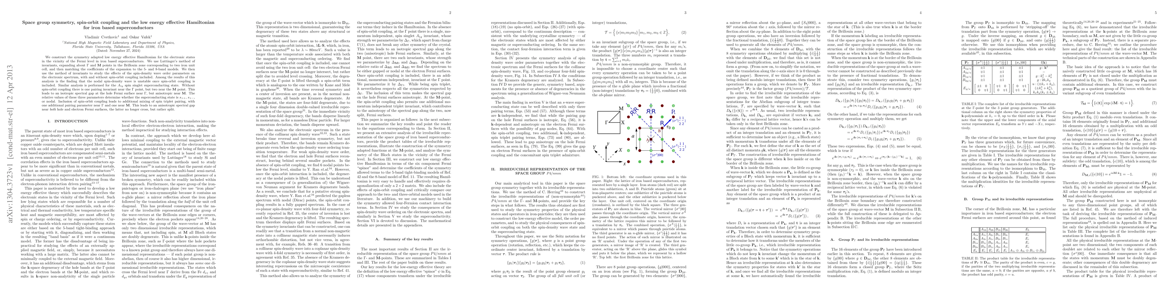 We construct the symmetry adapted low energy effective Hamiltonian for the electronic states in the vicinity of the Fermi level in iron based superconductors. We use Luttinger's method of invariants, expanding about Gamma and M points in the Brillouin zone corresponding to two iron unit cell, and then matching the coefficients of the expansion to the 5- and 8-band models. We then use the method of invariants to study the effects of the spin-density wave order parameters on the electronic spectrum, with and without spin-orbit coupling included. Among the results of this analysis is the finding that the nodal spin-density wave is unstable once spin-orbit coupling is included. Similar analysis is performed for the A_{1g} spin singlet superconducting state. Without spin-orbit coupling there is one pairing invariant near the Gamma point, but two near the M point. This leads to an isotropic spectral gap at the hole Fermi surface near Gamma, but anisotropic near M. The relative values of these three parameters determine whether the superconducting state is s_{++}, s_{+-}, or nodal. Inclusion of spin-orbit coupling leads to additional mixing of spin triplet pairing, with one additional pairing parameter near Gamma and one near M. This leads to an anisotropic spectral gap near both hole and electron Fermi surfaces, the latter no longer cross, but rather split.