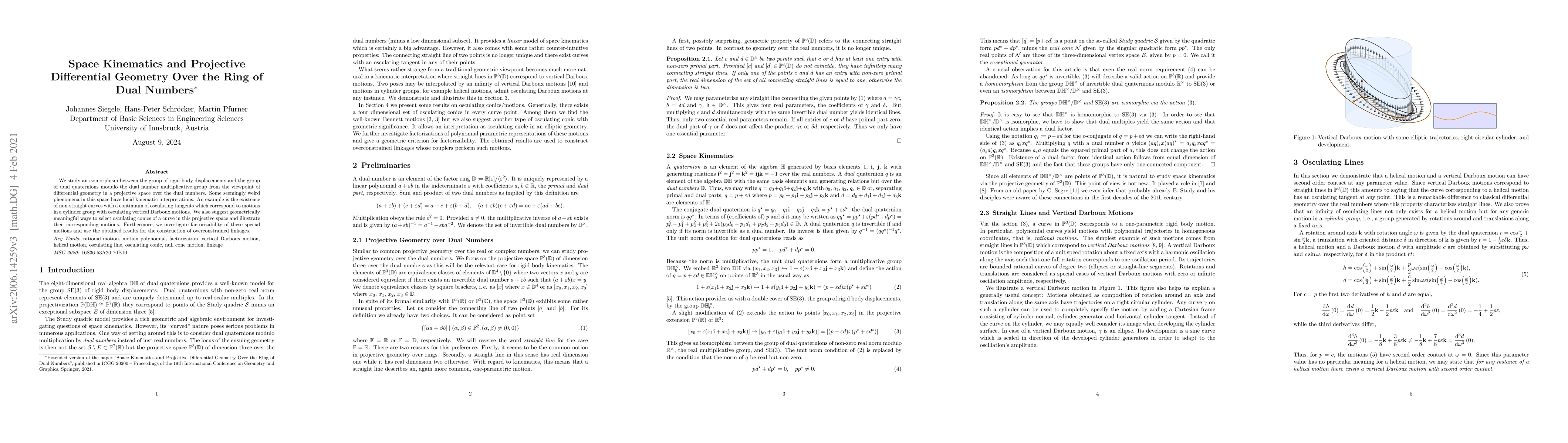 This paper explores an isomorphism between rigid body displacements and dual quaternions, revealing kinematic phenomena in projective differential geometry over dual numbers, including non-straight curves with multiple osculating tangents and methods for constructing overconstrained linkages.