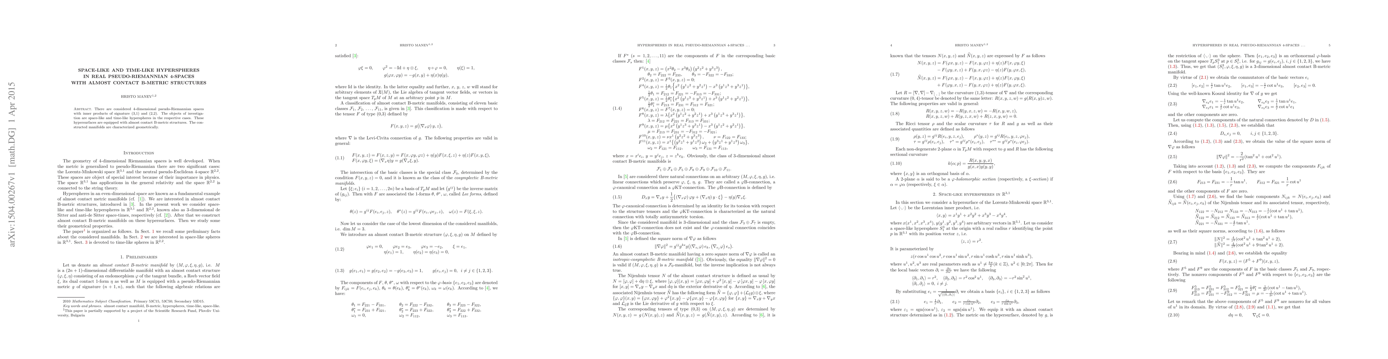 There are considered 4-dimensional pseudo-Riemannian spaces with inner products of signature (3,1) and (2,2). The objects of investigation are space-like and time-like hyperspheres in the respective cases. These hypersurfaces are equipped with almost contact B-metric structures. The constructed manifolds are characterized geometrically.