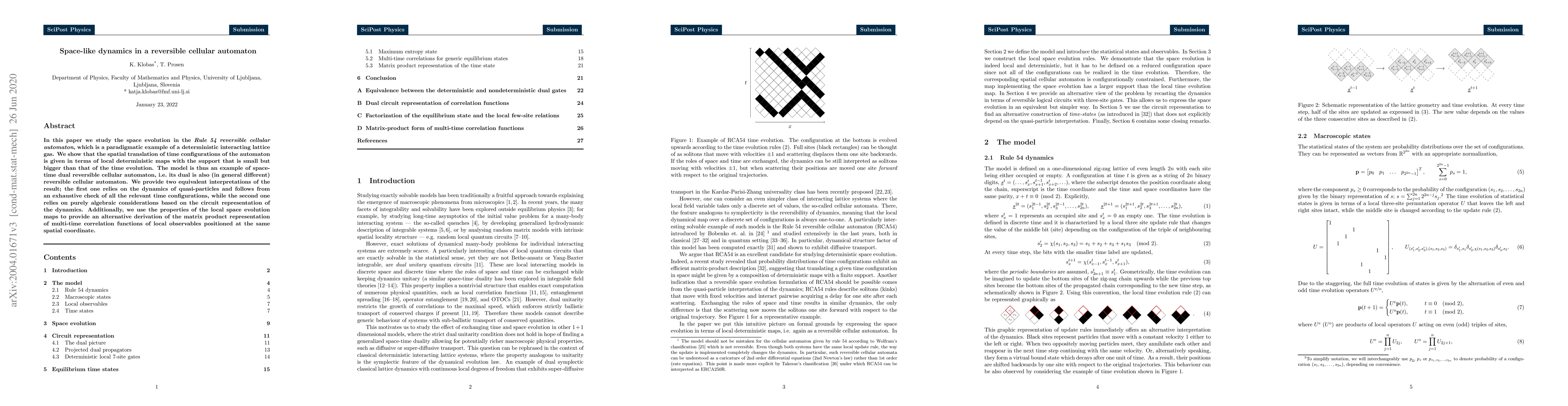 This paper explores the space-like dynamics in the Rule 54 reversible cellular automaton, demonstrating that its spatial translation corresponds to local deterministic maps. The authors provide two interpretations: one based on quasi-particles and the other on algebraic circuit representations, and use these to derive a matrix product representation for multi-time correlation functions.