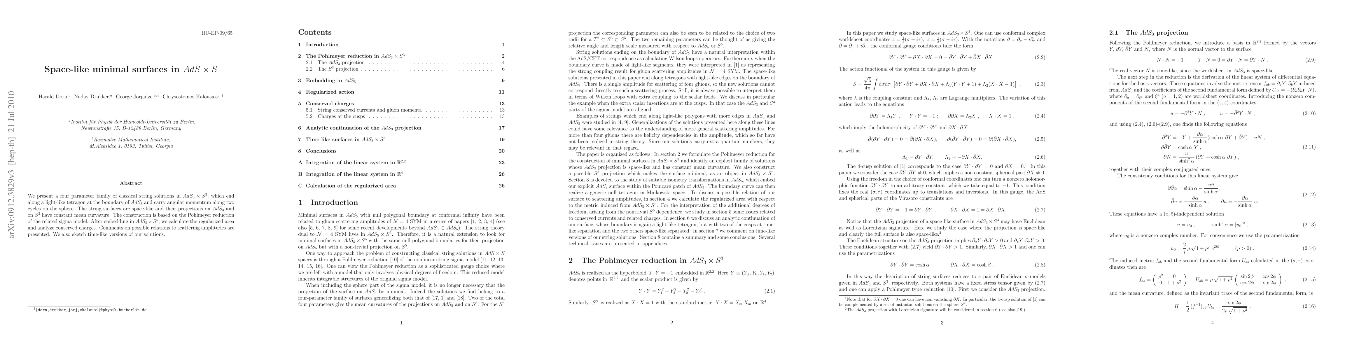 This paper introduces a four-parameter family of space-like minimal surfaces in AdS_3 x S^3, constructed via Pohlmeyer reduction, and analyzes their area and conserved charges. The solutions relate to scattering amplitudes and have potential time-like versions.