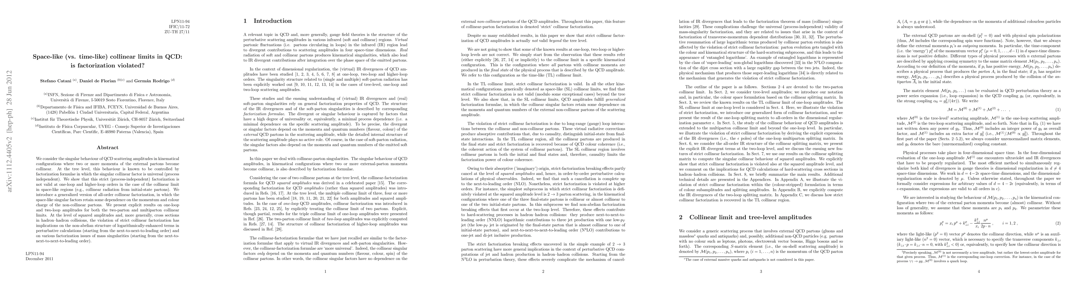 We consider the singular behaviour of QCD scattering amplitudes in kinematical configurations where two or more momenta of the external partons become collinear. At the tree level, this behaviour is known to be controlled by factorization formulae in which the singular collinear factor is universal (process independent). We show that this strict (process-independent) factorization is not valid at one-loop and higher-loop orders in the case of the collinear limit in space-like regions (e.g., collinear radiation from initial-state partons). We introduce a generalized version of all-order collinear factorization, in which the space-like singular factors retain some dependence on the momentum and colour charge of the non-collinear partons. We present explicit results on one-loop and two-loop amplitudes for both the two-parton and multiparton collinear limits. At the level of square amplitudes and, more generally, cross sections in hadron--hadron collisions, the violation of strict collinear factorization has implications on the non-abelian structure of logarithmically-enhanced terms in perturbative calculations (starting from the next-to-next-to-leading order) and on various factorization issues of mass singularities (starting from the next-to-next-to-next-to-leading order).