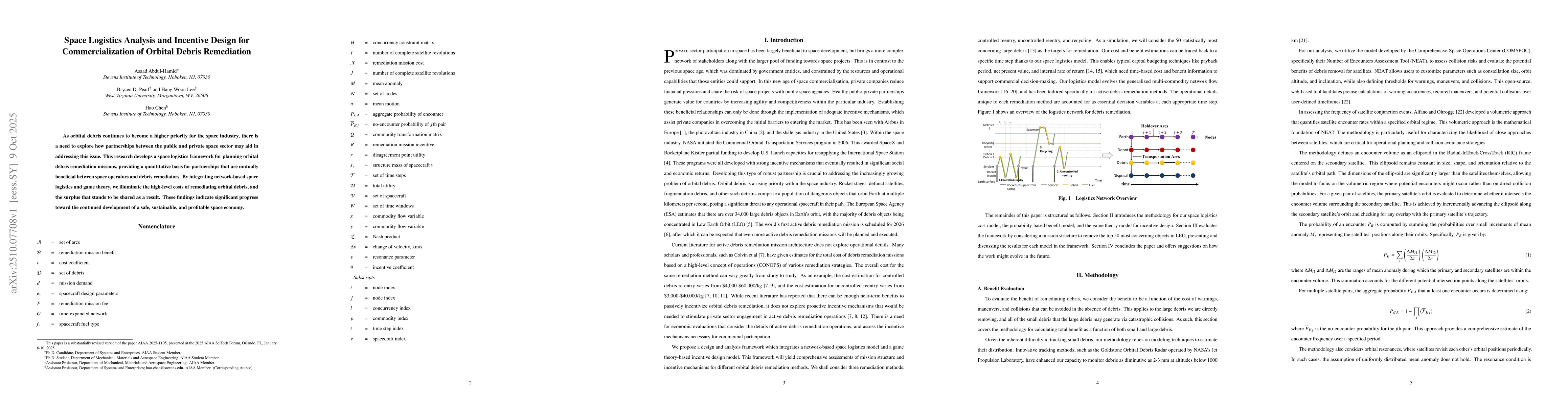 This research provides a commercialization framework for orbital debris remediation that balances cost optimization with stakeholder incentives, offering practical solutions for sustainable space environment management.