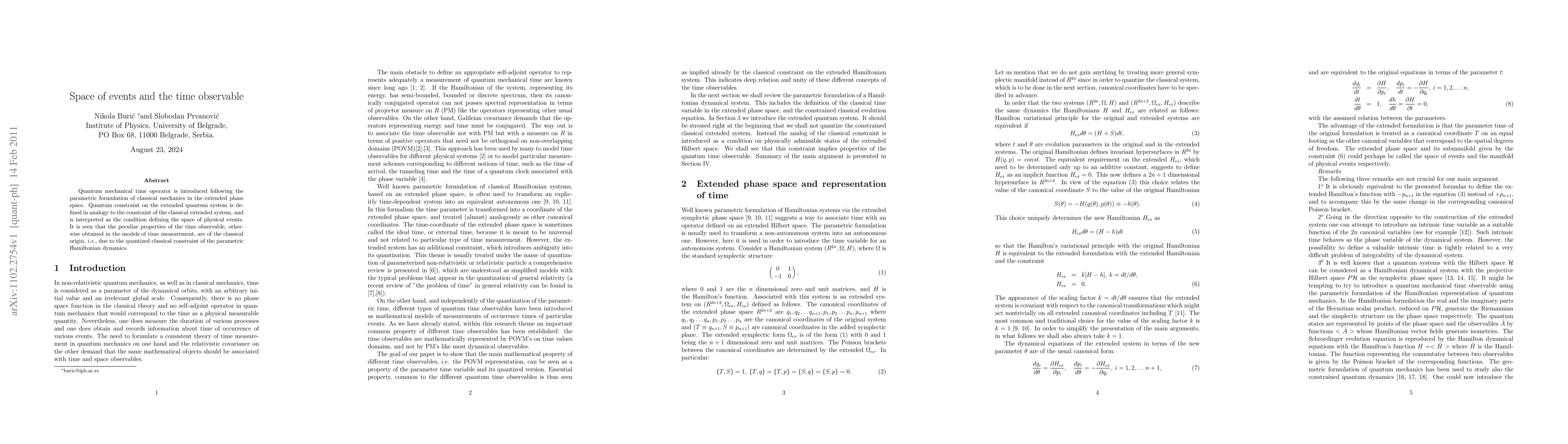 This paper introduces a quantum mechanical time operator in the context of extended phase space, defining a quantum constraint analogous to classical constraints. It concludes that the unique properties of the time observable in quantum models stem from the classical quantization of parametric Hamiltonian dynamics.