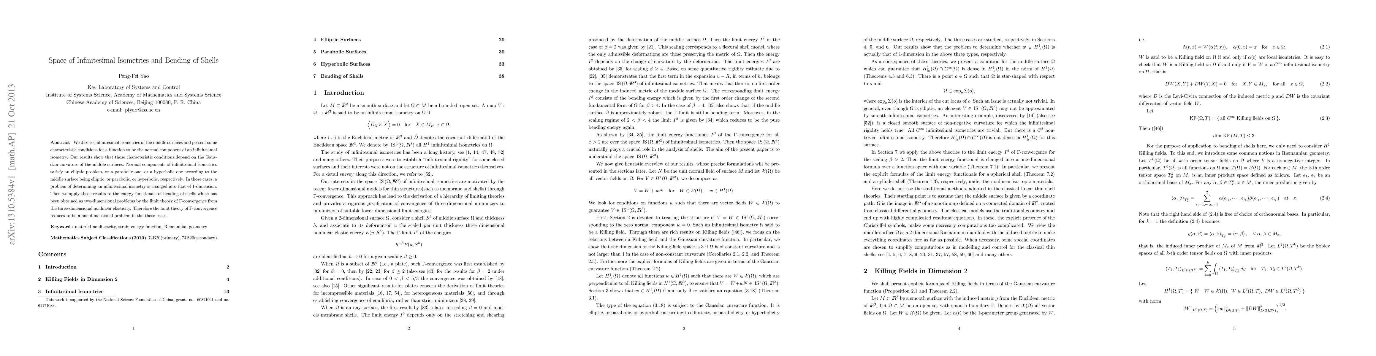 We discuss infinitesimal isometries of the middle surfaces and present some characteristic conditions for a function to be the normal component of an infinitesimal isometry. Our results show that those characteristic conditions depend on the Gaussian curvature of the middle surfaces: Normal components of infinitesimal isometries satisfy an elliptic problem, or a parabolic one, or a hyperbolic one according to the middle surface being elliptic, or parabolic, or hyperbolic, respectively. In those cases, a problem of determining an infinitesimal isometry is changed into that of 1-dimension. Then we apply those results to the energy functionals of bending of shells which has been obtained as two-dimensional problems by the limit theory of Gamma-convergence from the three-dimensional nonlinear elasticity. Therefore the limit theory of Gamma-convergence reduces to be a one-dimensional problem in the those cases.