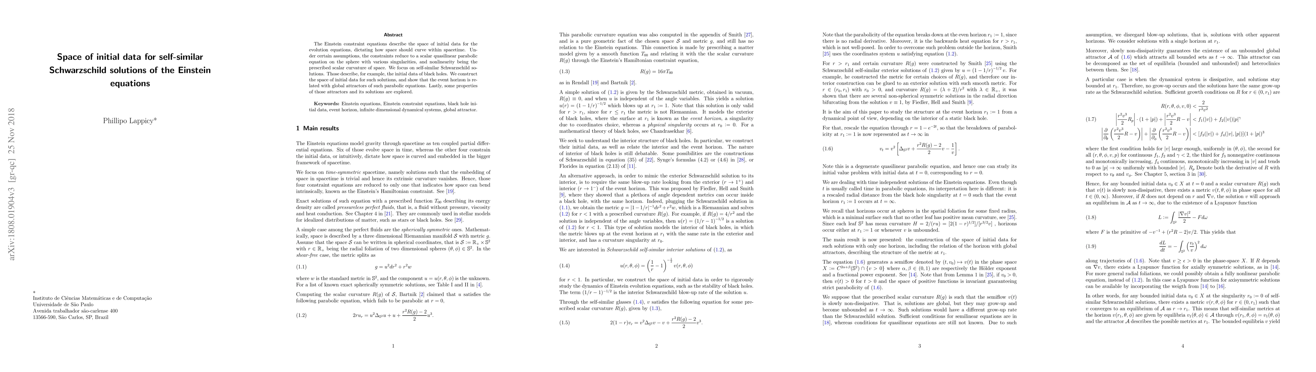 The Einstein constraint equations describe the space of initial data for the evolution equations, dictating how space should curve within spacetime. Under certain assumptions, the constraints reduce to a scalar quasilinear parabolic equation on the sphere with various singularities, and nonlinearity being the prescribed scalar curvature of space. We focus on self-similar Schwarzschild solutions. Those describe, for example, the initial data of black holes. We construct the space of initial data for such solutions, and show that the event horizon is related with global attractors of such parabolic equations. Lastly, some properties of those attractors and its solutions are explored.