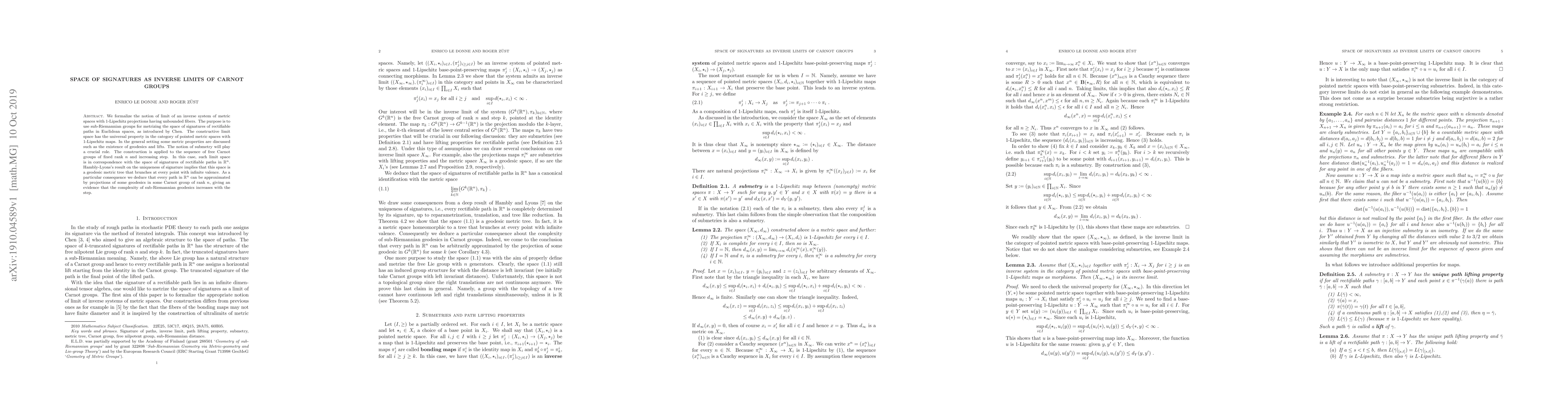 We formalize the notion of limit of an inverse system of metric spaces with $1$-Lipschitz projections having unbounded fibers. The purpose is to use sub-Riemannian groups for metrizing the space of signatures of rectifiable paths in Euclidean spaces, as introduced by Chen. The constructive limit space has the universal property in the category of pointed metric spaces with 1-Lipschitz maps. In the general setting some metric properties are discussed such as the existence of geodesics and lifts. The notion of submetry will play a crucial role. The construction is applied to the sequence of free Carnot groups of fixed rank $n$ and increasing step. In this case, such limit space is in correspondence with the space of signatures of rectifiable paths in $\mathbb R^n$. Hambly-Lyons's result on the uniqueness of signature implies that this space is a geodesic metric tree that brunches at every point with infinite valence. As a particular consequence we deduce that every path in $\mathbb R^n$ can be approximated by projections of some geodesics in some Carnot group of rank $n$, giving an evidence that the complexity of sub-Riemannian geodesics increases with the step.