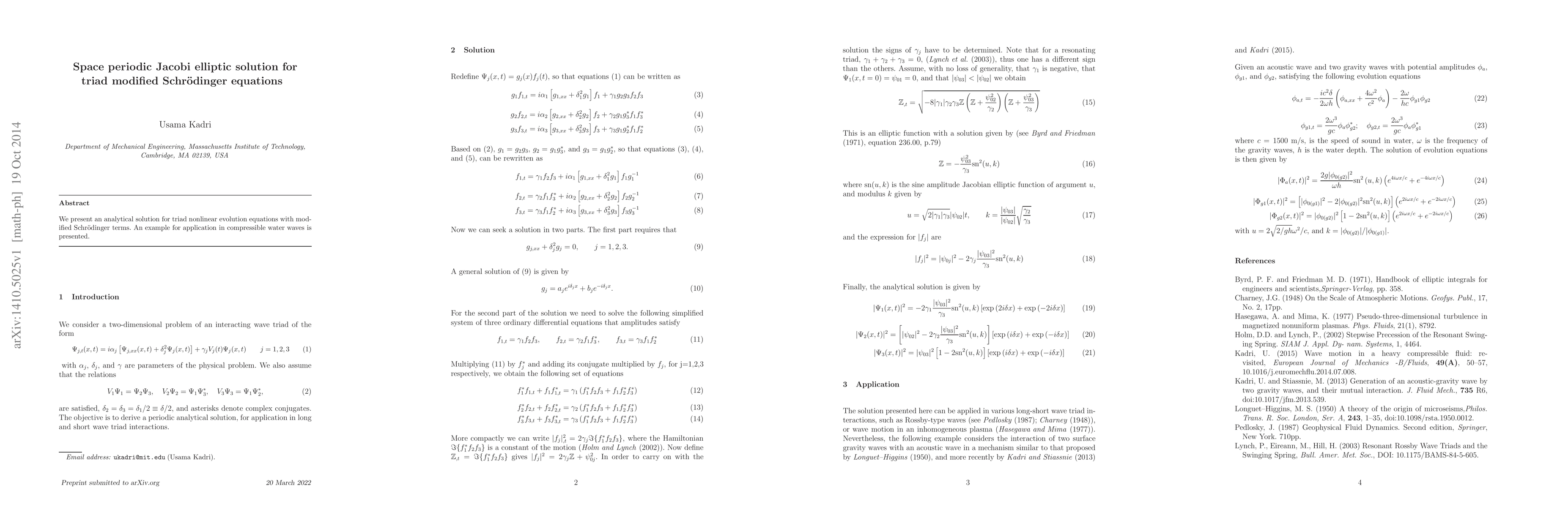 Summary: This paper provides an analytical solution for triad modified Schrödinger equations using space periodic Jacobi elliptic functions, demonstrating its application in modeling compressible water waves. The method offers a new approach to solving nonlinear evolution equations.