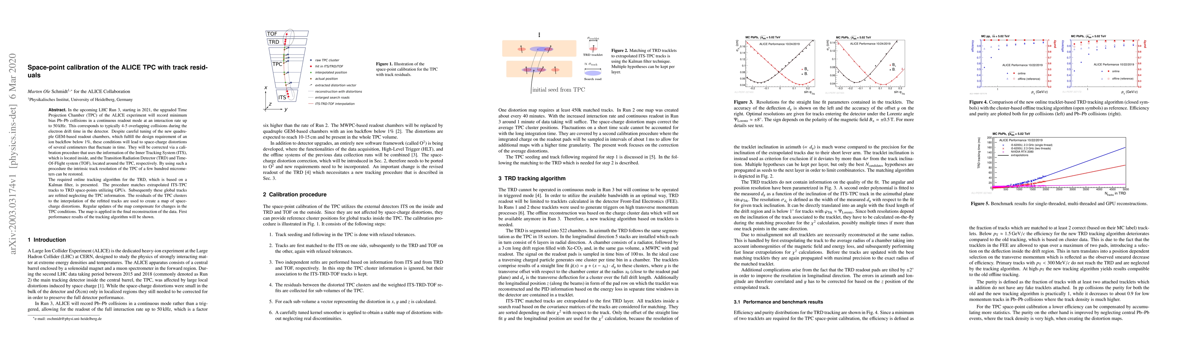 In the upcoming LHC Run 3, starting in 2021, the upgraded Time Projection Chamber (TPC) of the ALICE experiment will record minimum bias Pb-Pb collisions in a continuous readout mode at an interaction rate up to 50 kHz. This corresponds to typically 4-5 overlapping collisions during the electron drift time in the detector. Despite careful tuning of the new quadruple GEM-based readout chambers, which fulfill the design requirement of an ion backflow below 1%, these conditions will lead to space-charge distortions of several centimeters that fluctuate in time. They will be corrected via a calibration procedure that uses the information of the Inner Tracking System (ITS), which is located inside, and the Transition Radiation Detector (TRD) and Time-Of-Flight system (TOF), located around the TPC, respectively. By using such a procedure the intrinsic track resolution of the TPC of a few hundred micrometers can be restored. The required online tracking algorithm for the TRD, which is based on a Kalman filter, is presented. The procedure matches extrapolated ITS-TPC tracks to TRD space-points utilizing GPUs. Subsequently these global tracks are refitted neglecting the TPC information. The residuals of the TPC clusters to the interpolation of the refitted tracks are used to create a map of space-charge distortions. Regular updates of the map compensate for changes in the TPC conditions. The map is applied in the final reconstruction of the data. First performance results of the tracking algorithm will be shown.