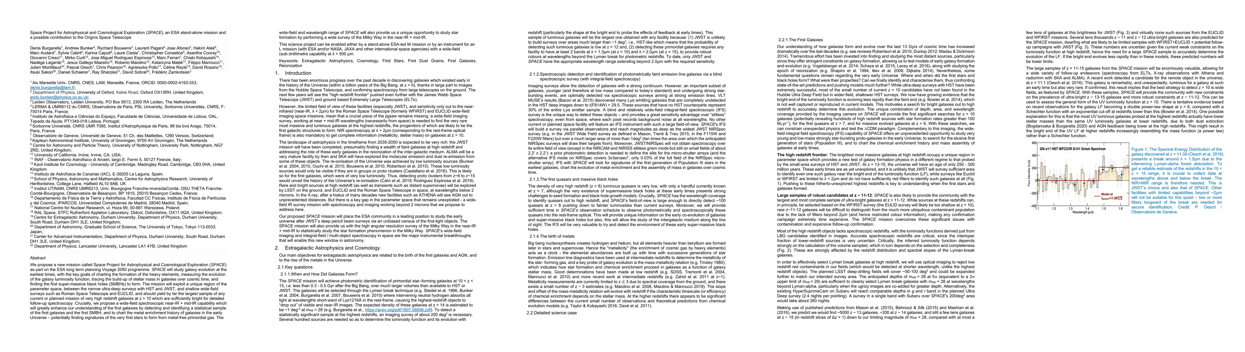 We propose a new mission called Space Project for Astrophysical and Cosmological Exploration (SPACE) as part on the ESA long term planning Voyage 2050 programme. SPACE will study galaxy evolution at the earliest times, with the key goals of charting the formation of the heavy elements, measuring the evolution of the galaxy luminosity function, tracing the build-up of stellar mass in galaxies over cosmic time, and finding the first super-massive black holes (SMBHs) to form. The mission will exploit a unique region of the parameter space, between the narrow ultra-deep surveys with HST and JWST, and shallow wide-field surveys such as Roman Space Telescope and EUCLID, and should yield by far the largest sample of any current or planned mission of very high redshift galaxies at z > 10 which are sufficiently bright for detailed follow-up spectroscopy. Crucially, we propose a wide-field spectroscopic near-IR + mid-IR capability which will greatly enhance our understanding of the first galaxies by detecting and identifying a statistical sample of the first galaxies and the first SMBH, and to chart the metal enrichment history of galaxies in the early Universe - potentially finding signatures of the very first stars to form from metal-free primordial gas. The wide-field and wavelength range of SPACE will also provide us a unique opportunity to study star formation by performing a wide survey of the Milky Way in the near-IR + mid-IR. This science project can be enabled either by a stand-alone ESA-led M mission or by an instrument for an L mission (with ESA and/or NASA, JAXA and other international space agencies) with a wide-field (sub-)millimetre capability at wavelength > 500 microns.