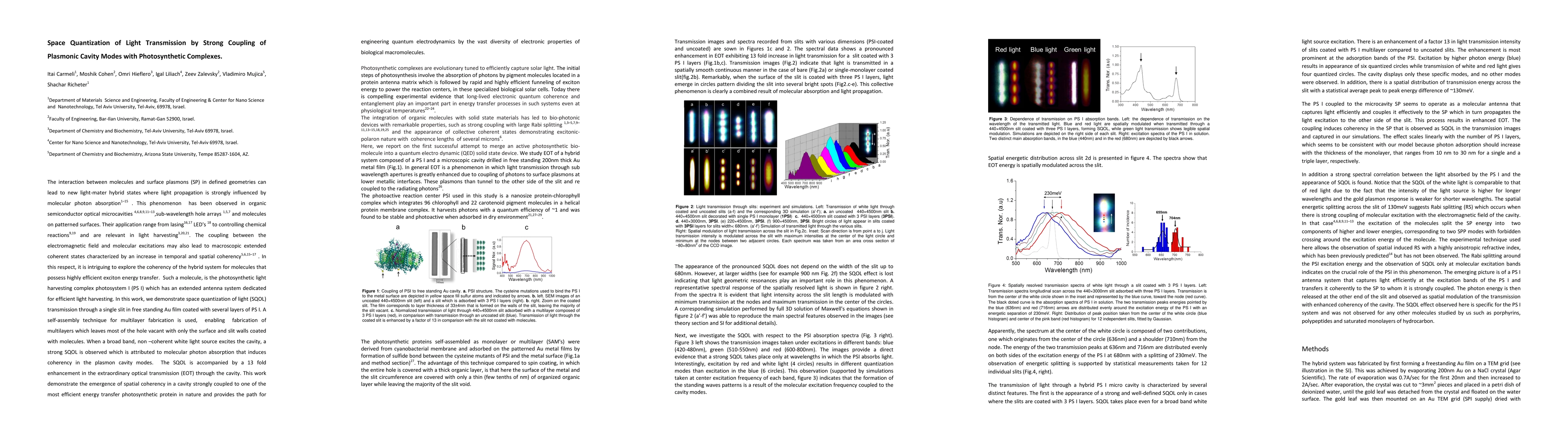 The interaction between molecules and surface plasmons in defined geometries can lead to new light mater hybrid states where light propagation is strongly influenced by molecular photon absorption. Their application range from lasing LEDs to controlling chemical reactions and are relevant in light harvesting. The coupling between the electromagnetic field and molecular excitations may also lead to macroscopic extended coherent states characterized by an increase in temporal and spatial coherency. In this respect, it is intriguing to explore the coherency of the hybrid system for molecules that possess highly efficient exciton energy transfer. Such a molecule, is the photosynthetic light harvesting complex photosystem I which has an extended antenna system dedicated for efficient light harvesting. In this work, we demonstrate space quantization of light transmission through a single slit in free standing Au film coated with several layers of PS I. A self assembly technique for multilayer fabrication is used, enabling fabrication of multilayers which leaves most of the hole vacant with only the surface and slit walls coated with molecules. When a broad band, non coherent white light source excites the cavity, a strong SQOL is observed which is attributed to molecular photon absorption that induces coherency in the plasmon cavity modes. The SQOL is accompanied by a 13 fold enhancement in the extraordinary optical transmission through the cavity. This work demonstrate the emergence of spatial coherency in a cavity strongly coupled to one of the most efficient energy transfer photosynthetic protein in nature and provides the path for engineering quantum electrodynamics by the vast diversity of electronic properties of biological macromolecules.