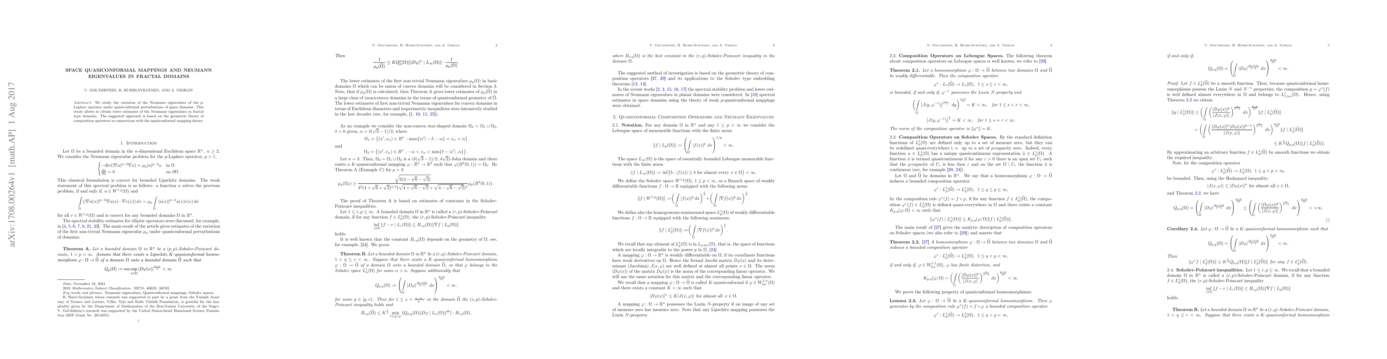 This paper investigates how Neumann eigenvalues of the $p$-Laplace operator change with quasiconformal perturbations of space domains, providing lower estimates for such eigenvalues in fractal domains through the geometric theory of composition operators and quasiconformal mappings.