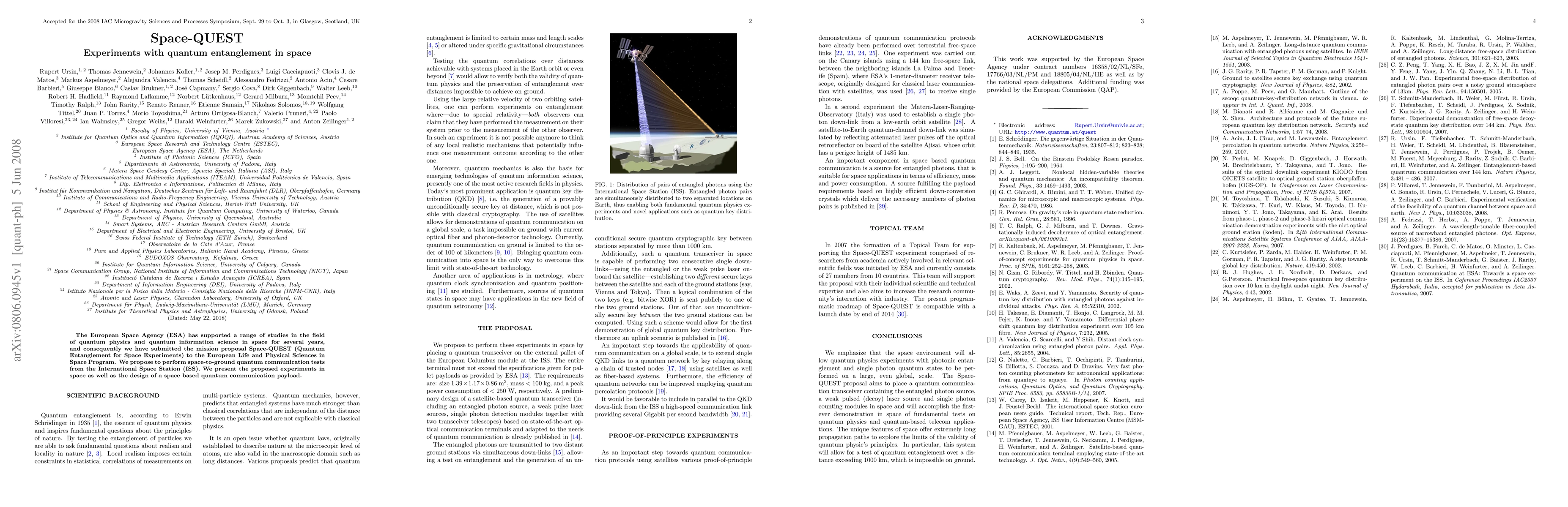 Summary: The Space-QUEST mission aims to explore quantum entanglement for space-to-ground communication tests from the ISS, supported by ESA, with a proposed payload designed for quantum communication experiments in space.