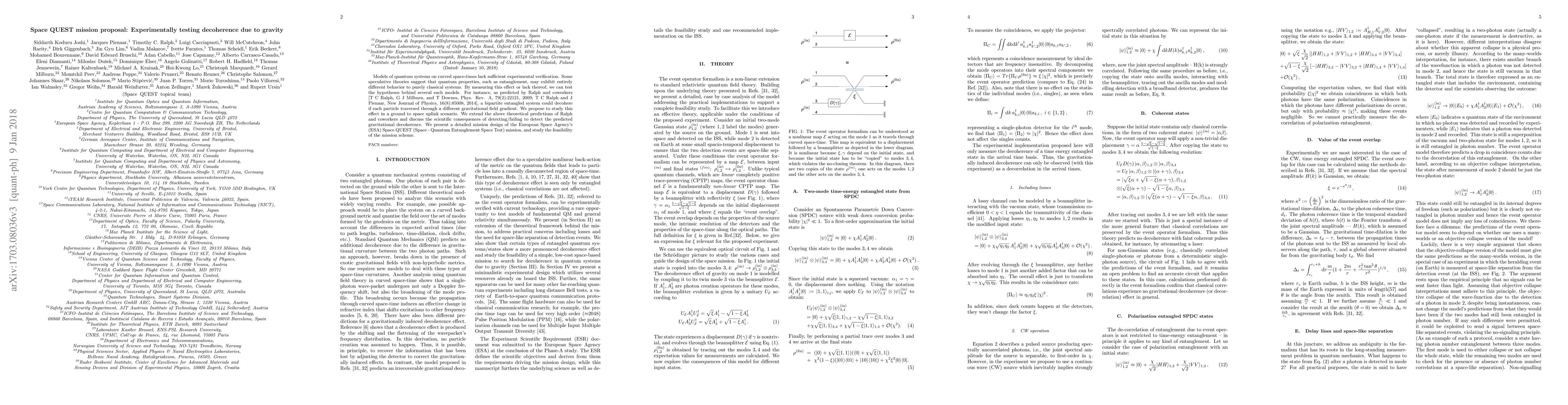 The Space QUEST mission aims to experimentally test quantum decoherence due to gravity by studying the behavior of entangled particles in varying gravitational fields. The proposed mission seeks to verify theoretical predictions about gravitational effects on quantum entanglement, offering insights into the differences between quantum and classical systems.