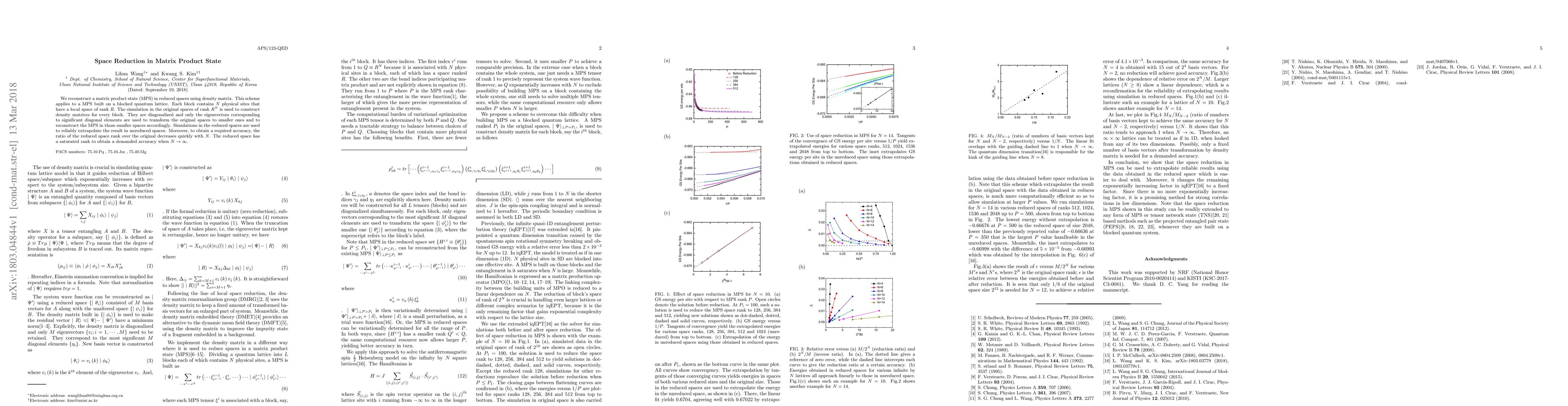 We reconstruct a matrix product state (MPS) in reduced spaces using density matrix. This scheme applies to a MPS built on a blocked quantum lattice. Each block contains $N$ physical sites that have a local space of rank $R$. The simulation in the original spaces of rank $R^N$ is used to construct density matrices for every block. They are diagonalized and only the eigenvectors corresponding to significant diagonal elements are used to transform the original spaces to smaller ones and to reconstruct the MPS in those smaller spaces accordingly. Simulations in the reduced spaces are used to reliably extrapolate the result in unreduced spaces. Moreover, to obtain a required accuracy, the ratio of the reduced space rank over the original decreases quickly with $N$. The reduced space has a saturated rank to obtain a demanded accuracy when $N\rightarrow \infty$.