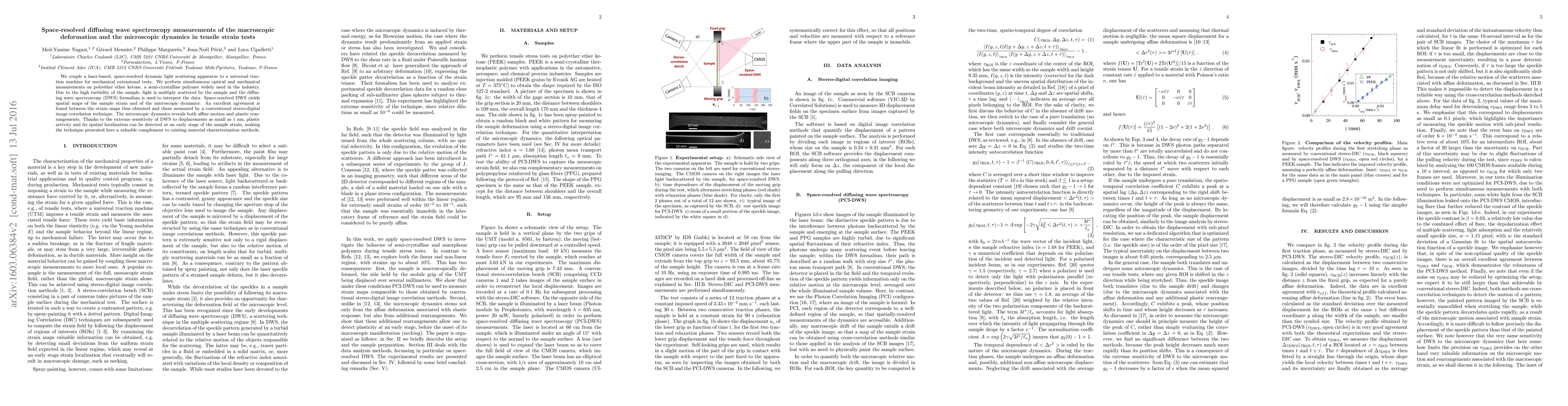 This paper combines laser-based diffusing wave spectroscopy with tensile tests to measure both macroscopic deformation and microscopic dynamics in polyether ether ketone. The technique reveals spatial strain maps and early-stage plastic activity, providing a detailed view of material behavior.